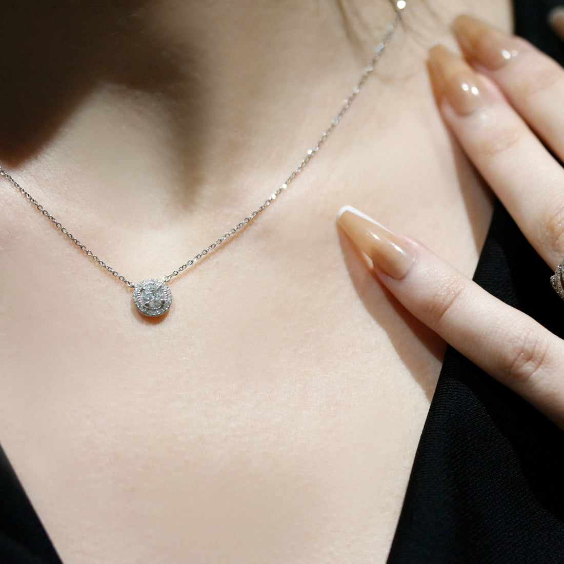力強く輝くメインのダイヤモンドのまわりをメレダイヤモンドで取り囲み、存在感のある輝きがデコルテをパッと華やかにしてくれます。