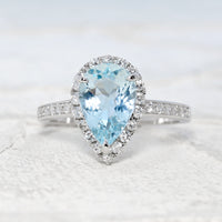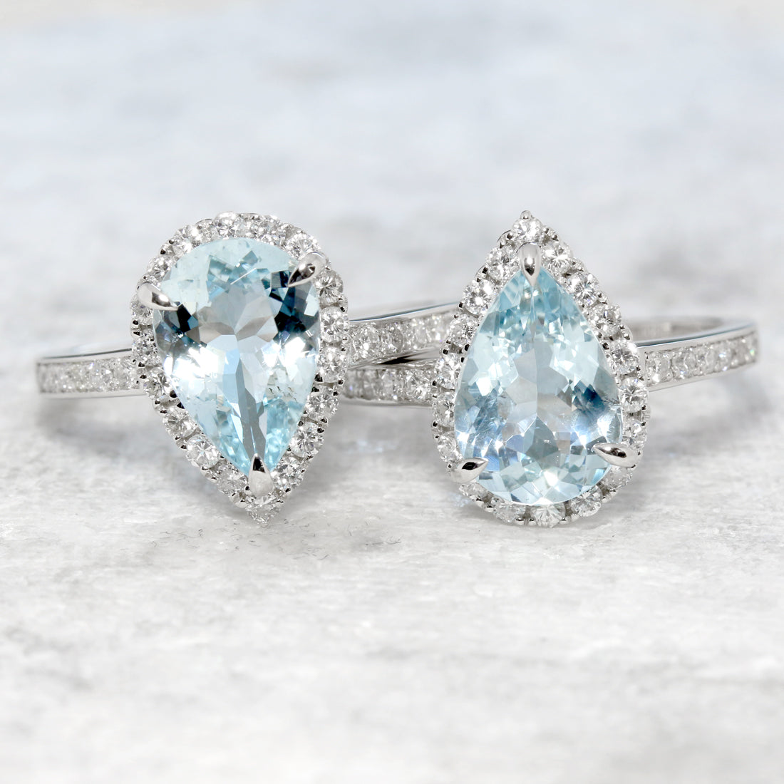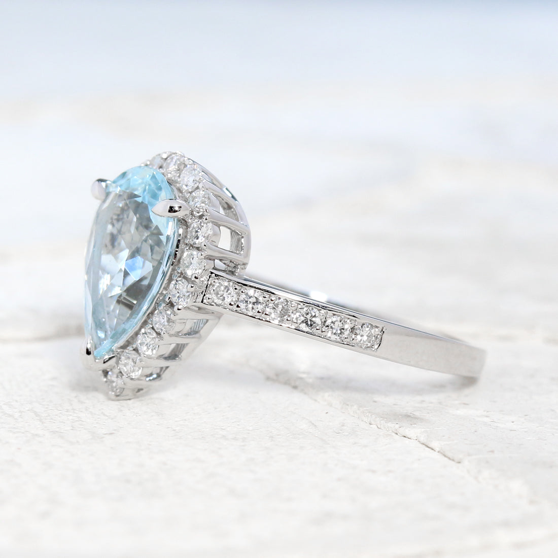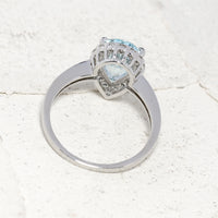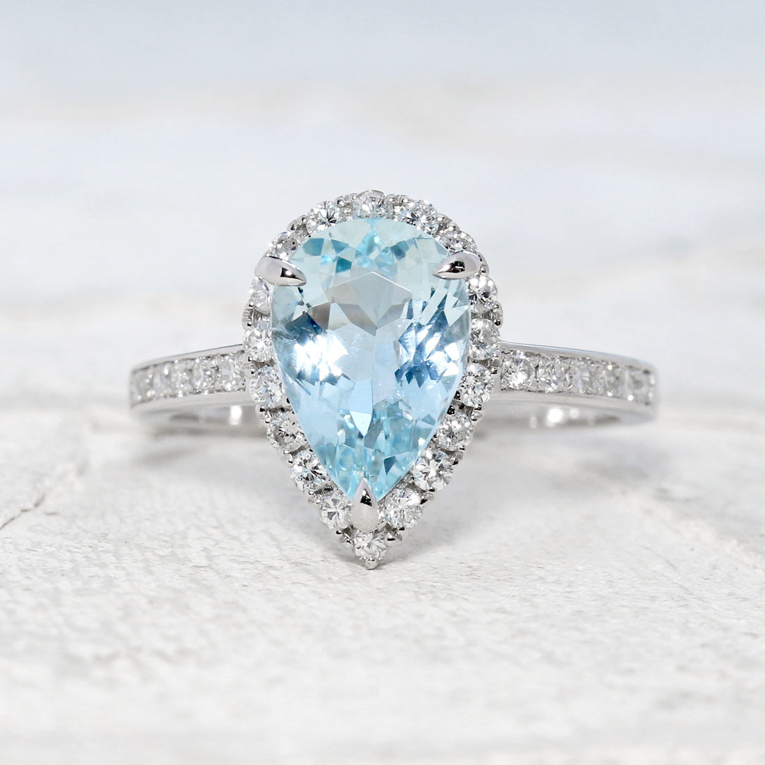 アクアマリンを取り囲むダイヤモンドのファイアが、アクアマリンのやわらかなブルーを引きたてます。