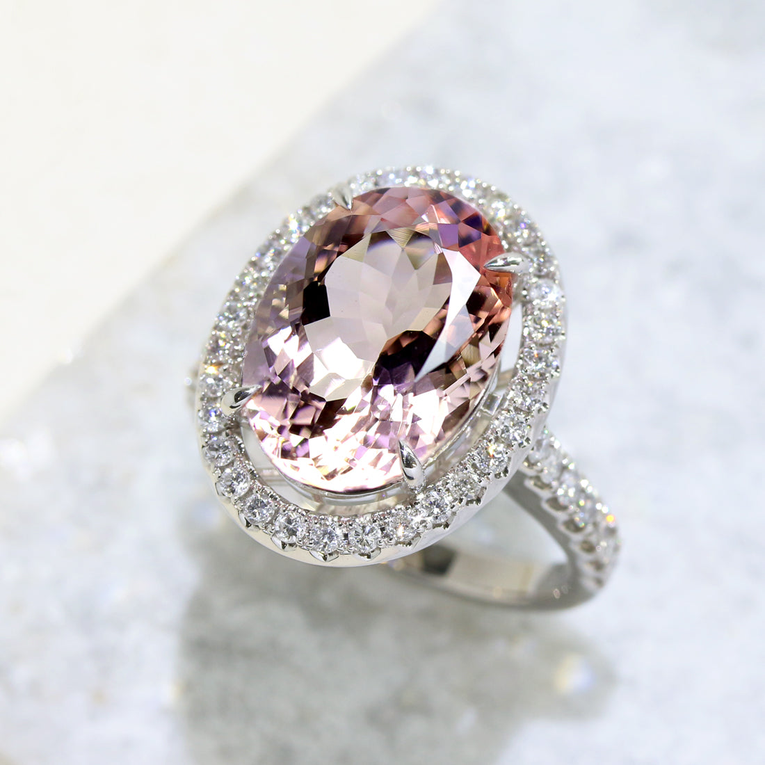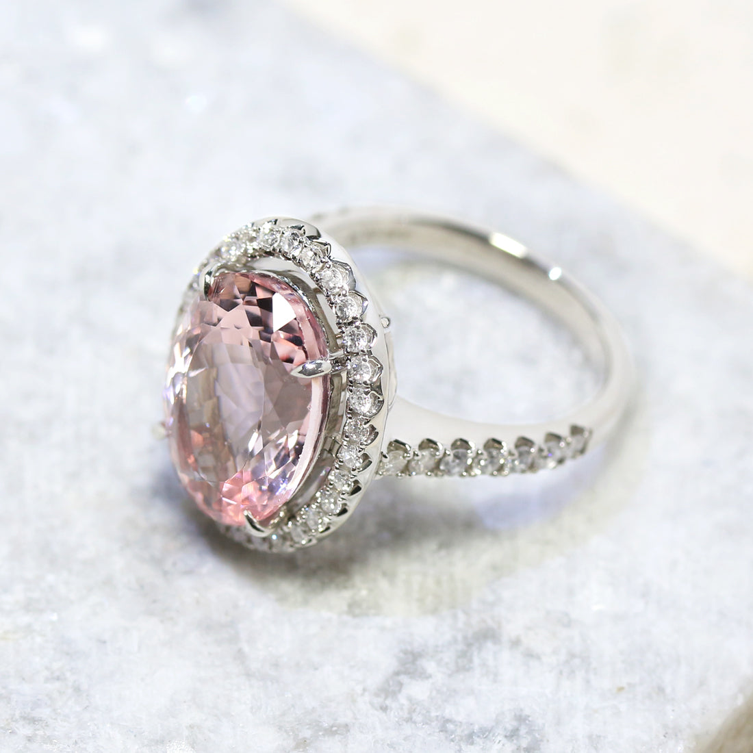繊細に敷き詰められたダイヤモンドが、モルガナイトの美しさをより一層引き立て、手元を華やかに彩ります。
