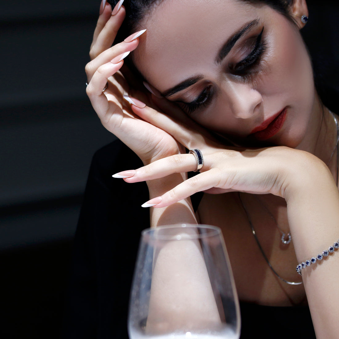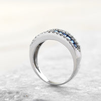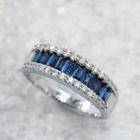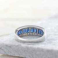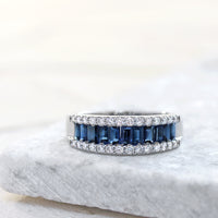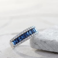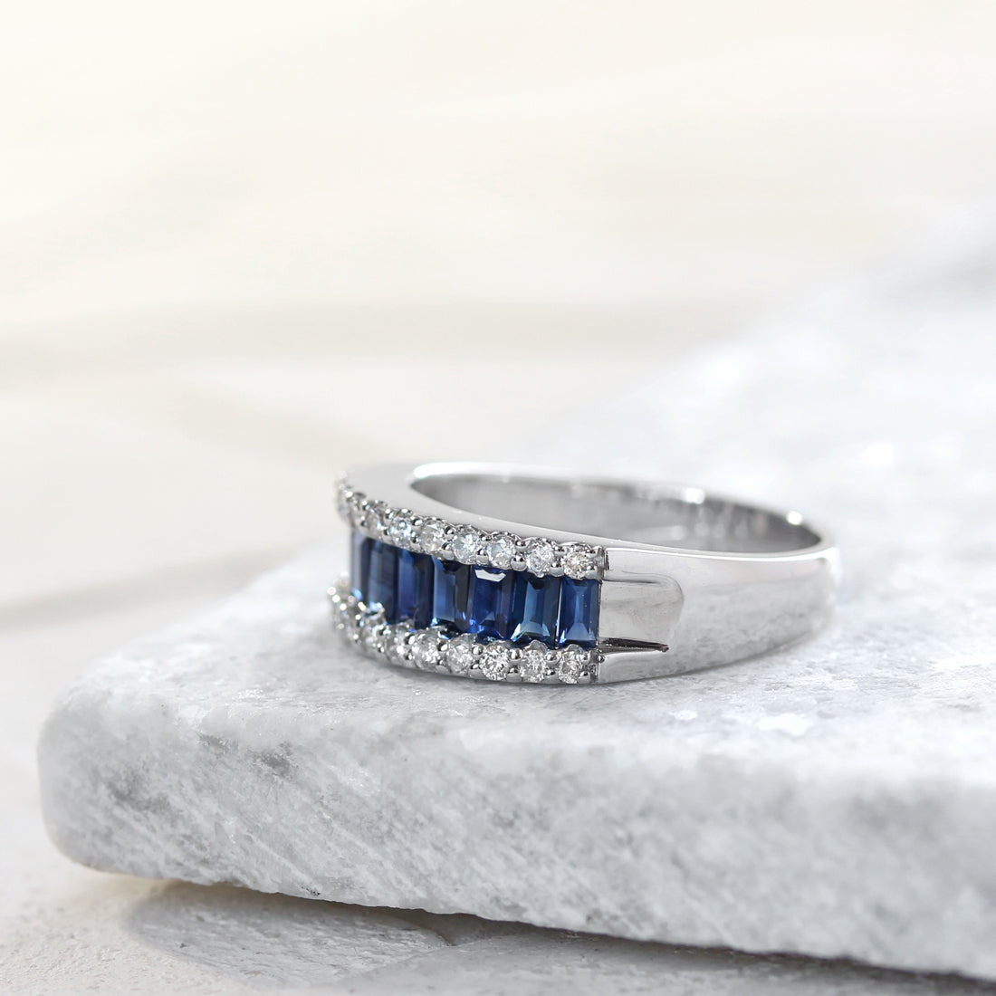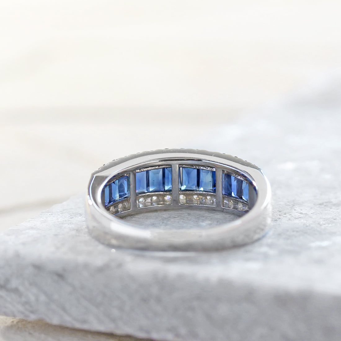 贅沢に敷き詰められた、バゲットカットサファイアとラウンドカットダイヤモンドがシックにお手元を飾り、ほどよいボリューム感のあるリングは男性にもおすすめです。