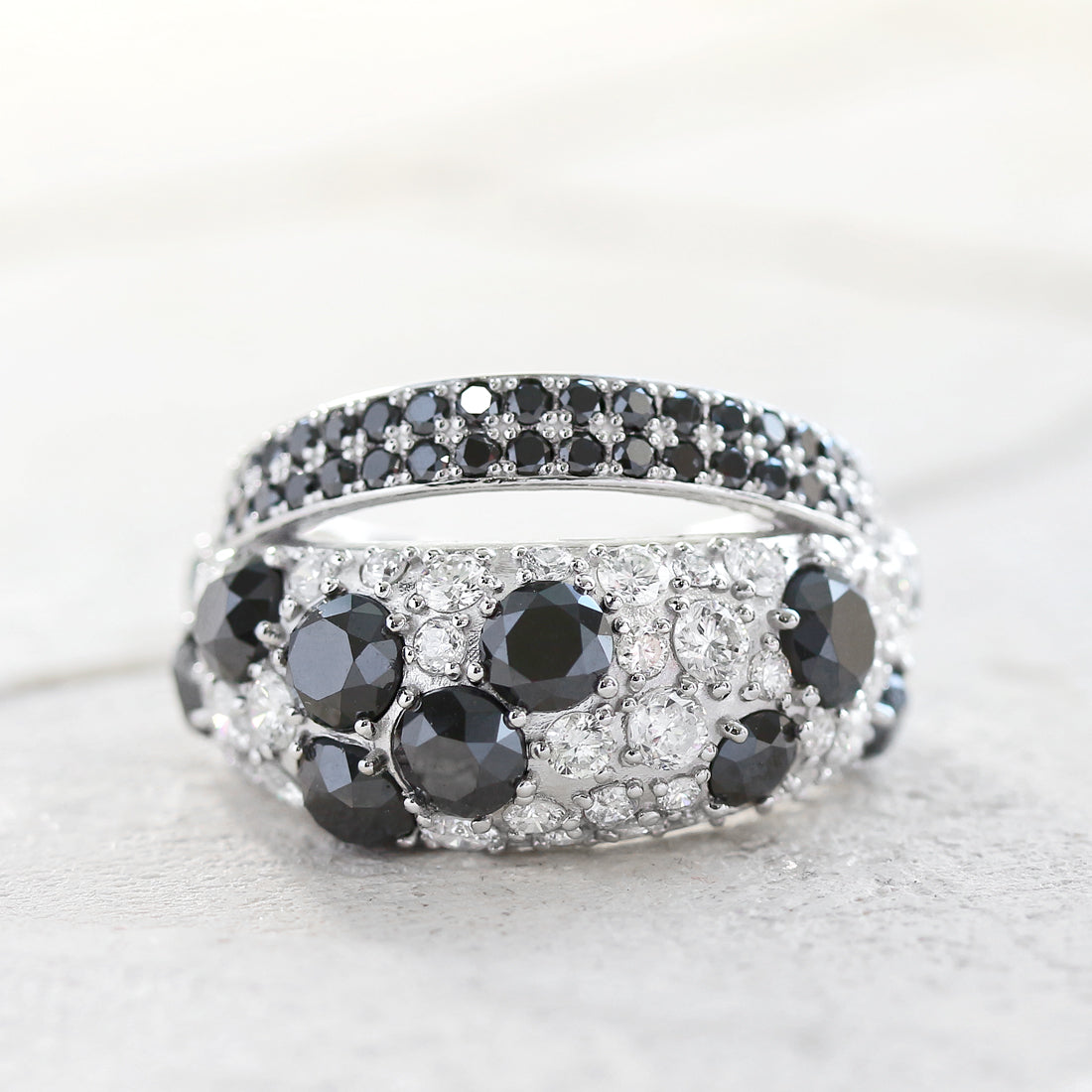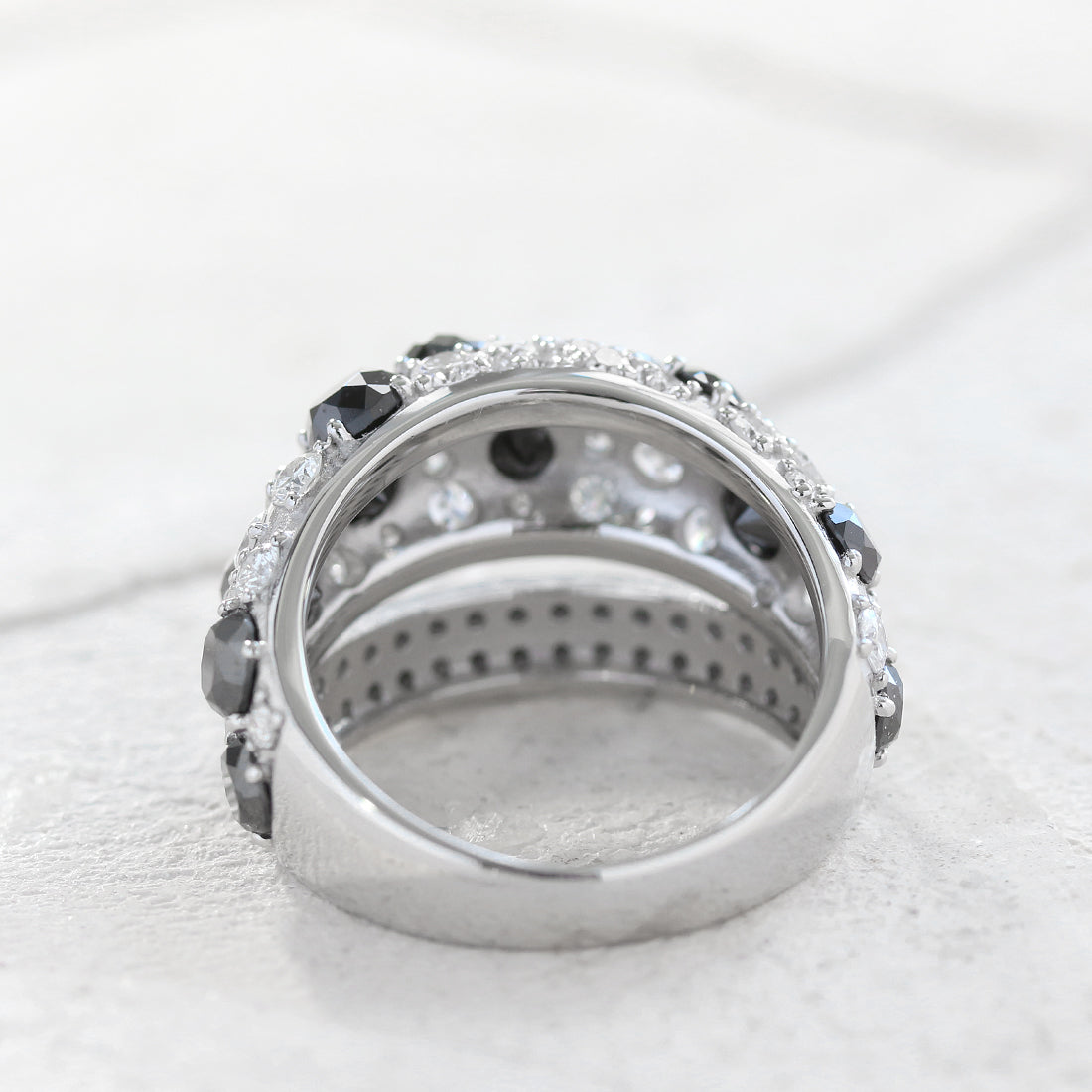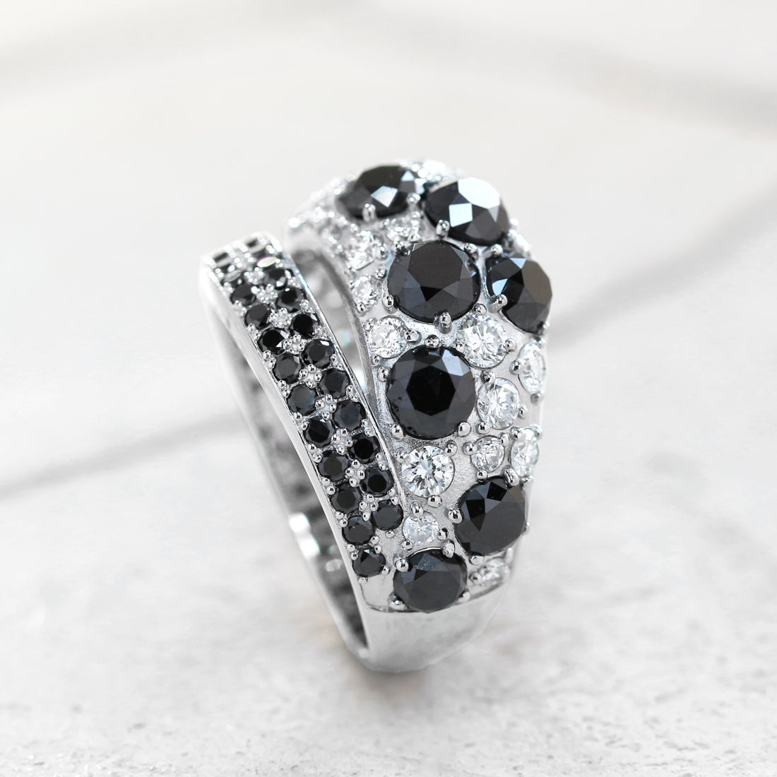 漆黒の艶めきとアシンメトリーなフォルムが、圧倒的なインパクトを放つブラック×ホワイトダイヤモンドリング。