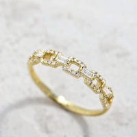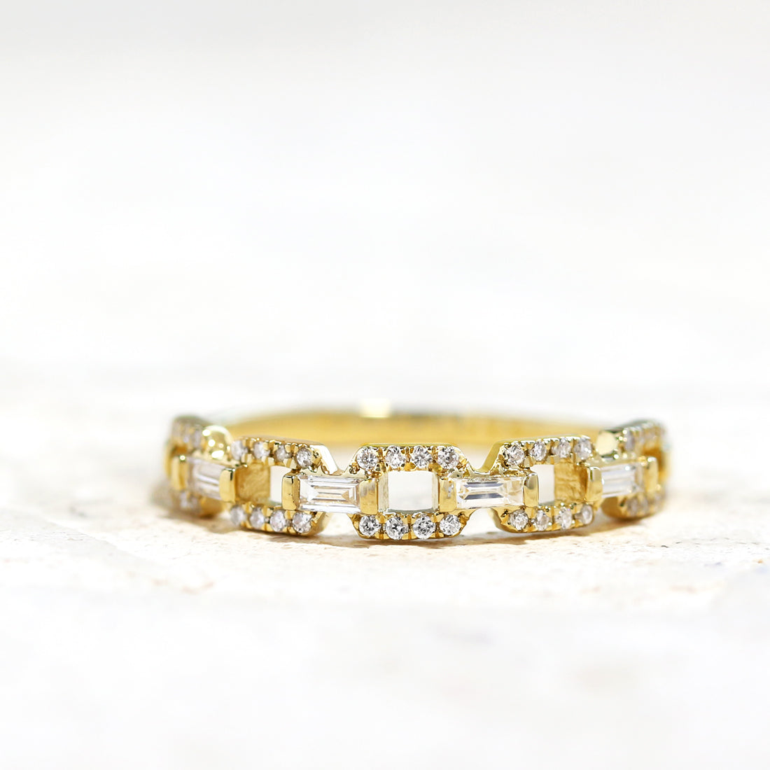 チェーンモチーフに、キラキラと煌めくラウンドカットダイヤモンドを敷き詰めたデイリーユースにぴったりなリング。コマとコマを繋ぐバゲットカットダイヤモンドから、チェーンモチーフのカジュアルなイメージと差をつける芯のあるファイアが煌めきを放ちます。華奢なデザインが一本でも、お手持ちのリングと重ね着けを楽しむのもおすすめ。