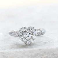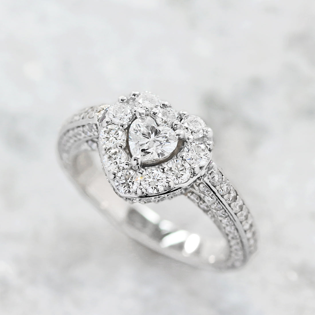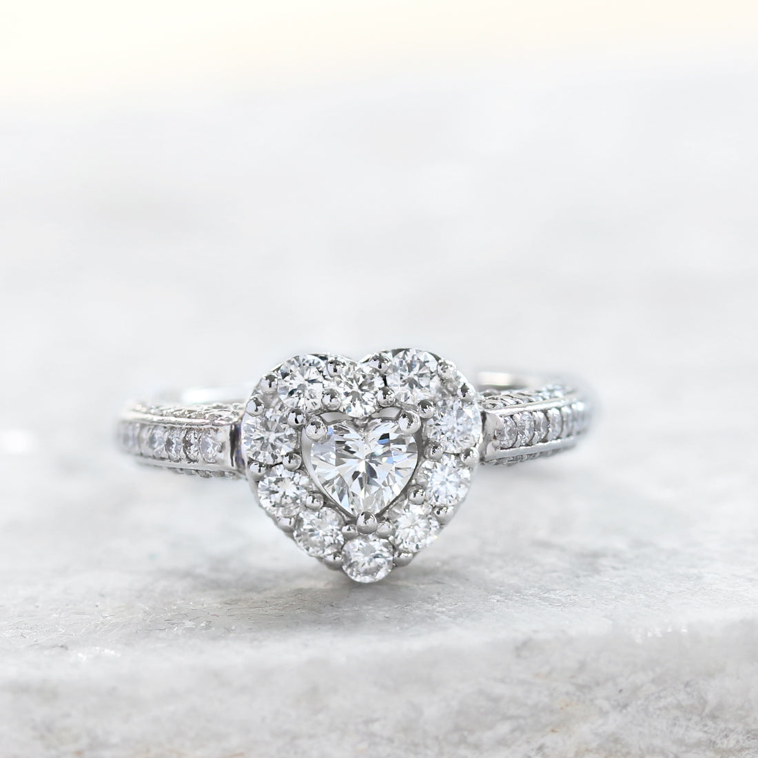 センターで凛と佇むハートシェイプカットダイヤモンドをメレダイヤモンドでさらに取り囲み、キラキラと絶えず煌めく、ロマンチックな輝きに心が躍ります。