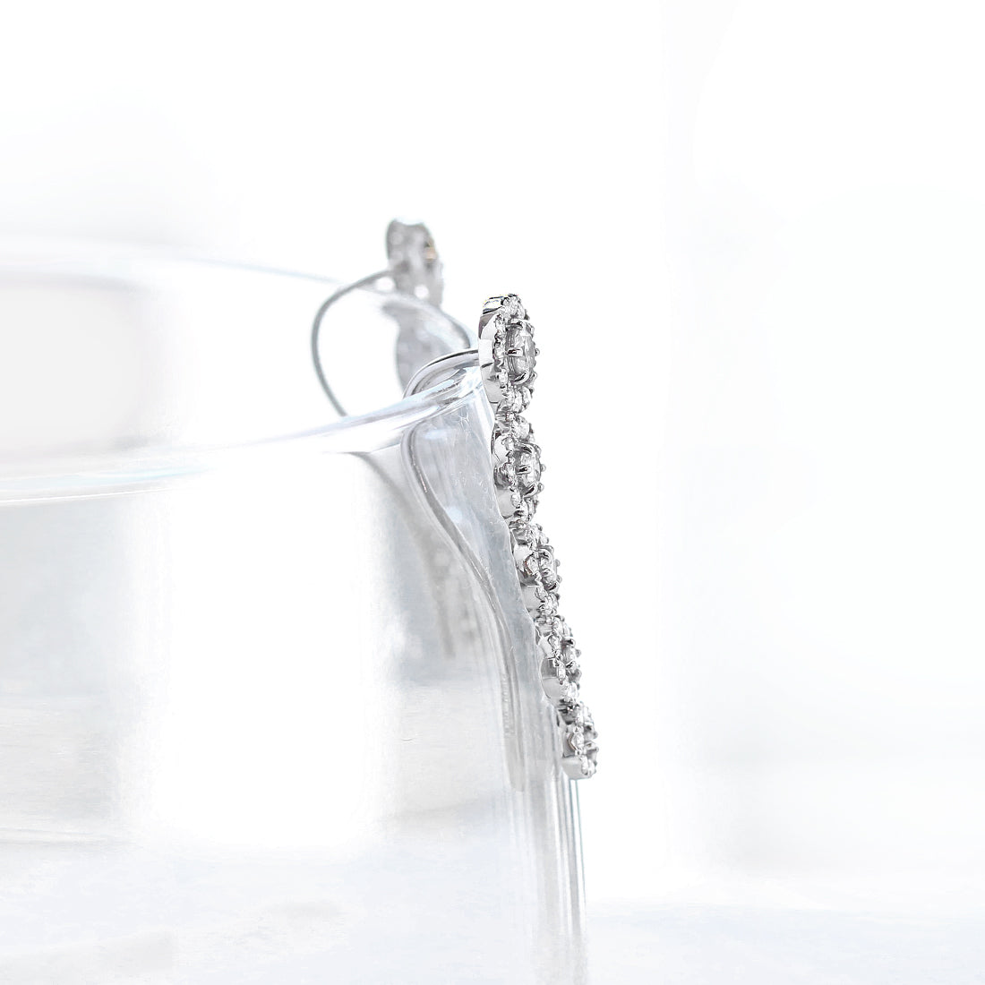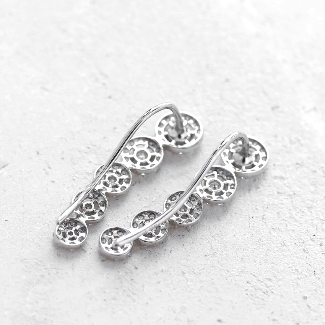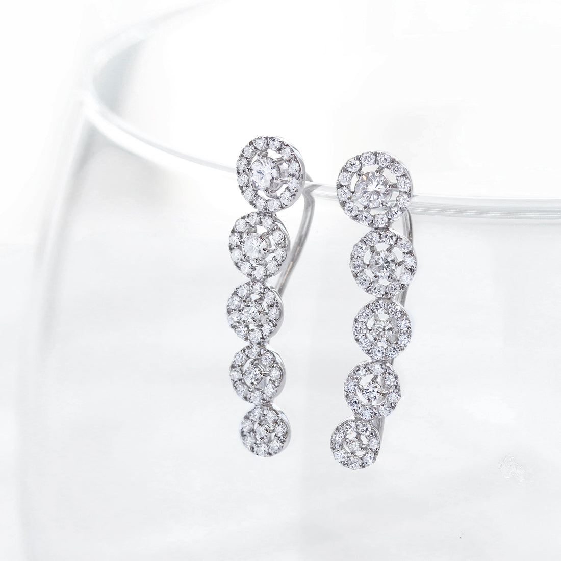 大小のグラデーションがまるでシンフォニーのようにしなやかに輝きを繋ぐダイヤモンドピアス。抜け感のあるヘイローデザインが耳元に寄り添うように並び、クリアなダイヤモンドがキラキラと煌めきます。引っかけて使うフックピアスとしてはもちろん、くるりと向きを変え耳たぶに沿わせても素敵。エレガントな大人の女性にぴったりの魅力的なジュエリーです。