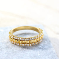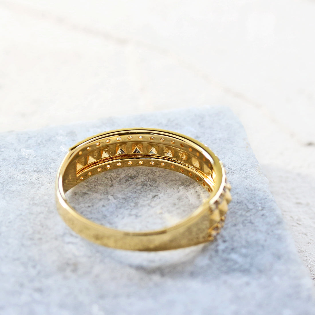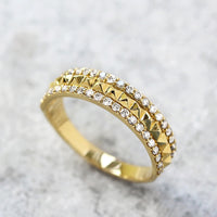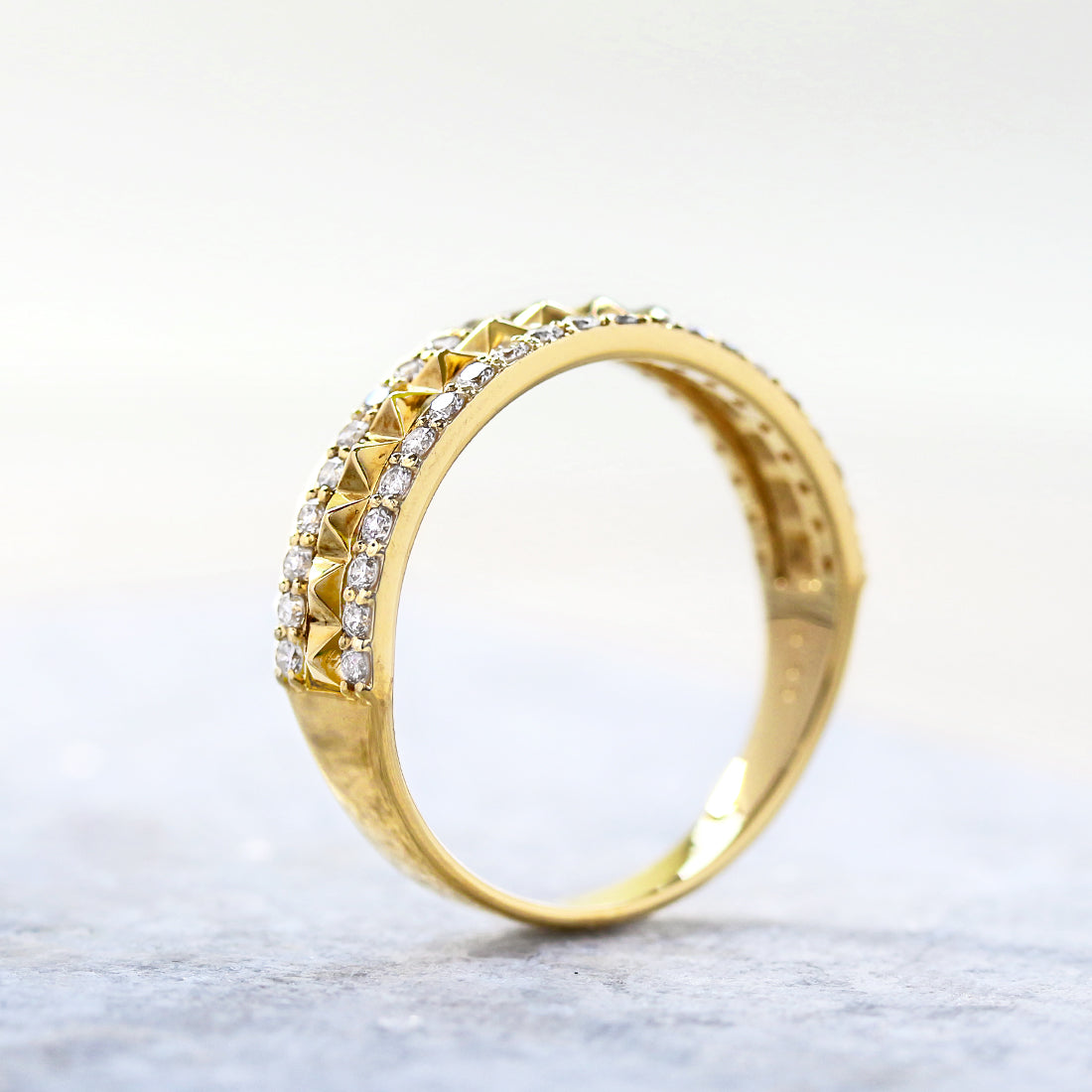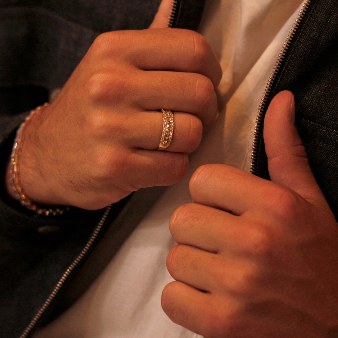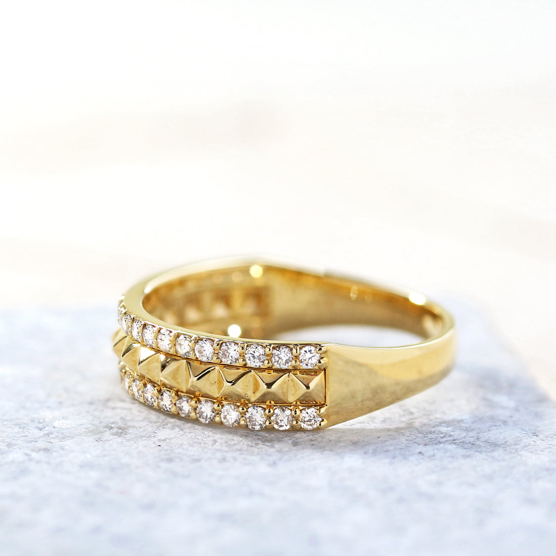 クリアな煌めきを放つダイヤモンドとパンキッシュなイエローゴールドのスタッズを並べ、存在感と個性を表現したダイヤモンドメンズリング。