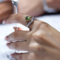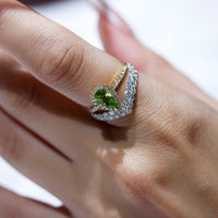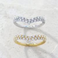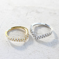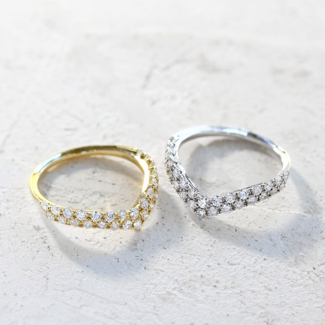 ひと粒ひと粒丁寧にセッティングされたダイヤモンドが放つまばゆいきらめきと、お指をすらりと長く見せてくれるシャープなVラインのシルエットが、女性らしいエレガントな美しさを演出。
