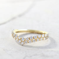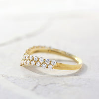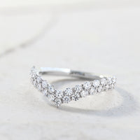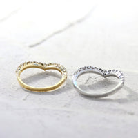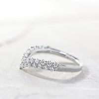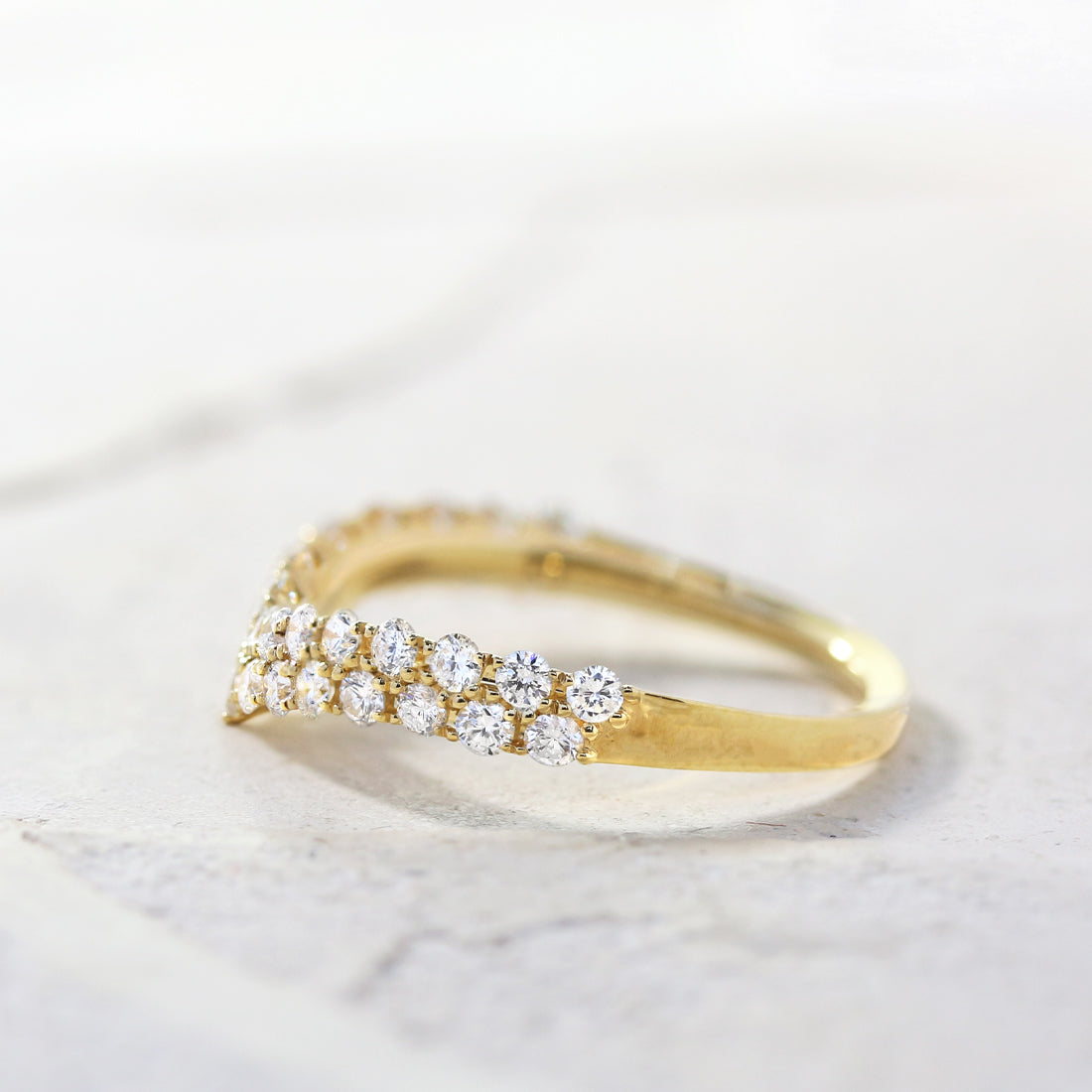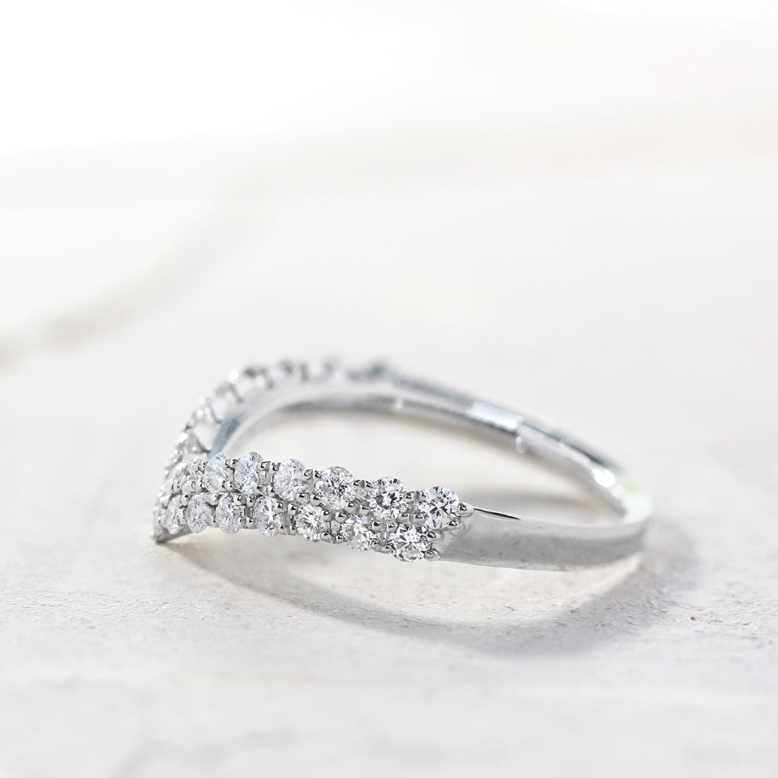 センターに向かって緩やかにV字を描く、上品なデザインのダイヤモンドリング。