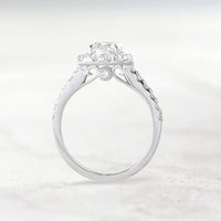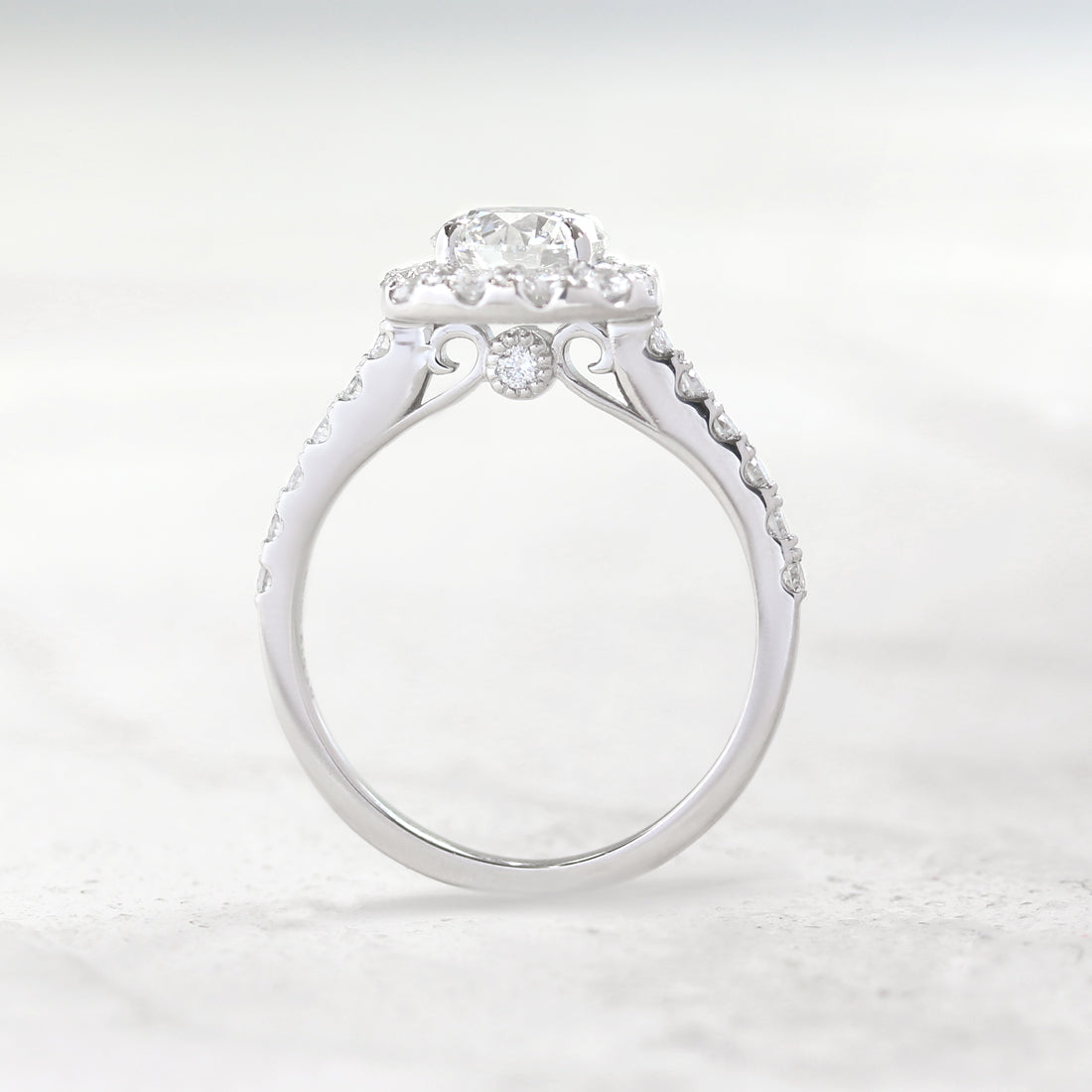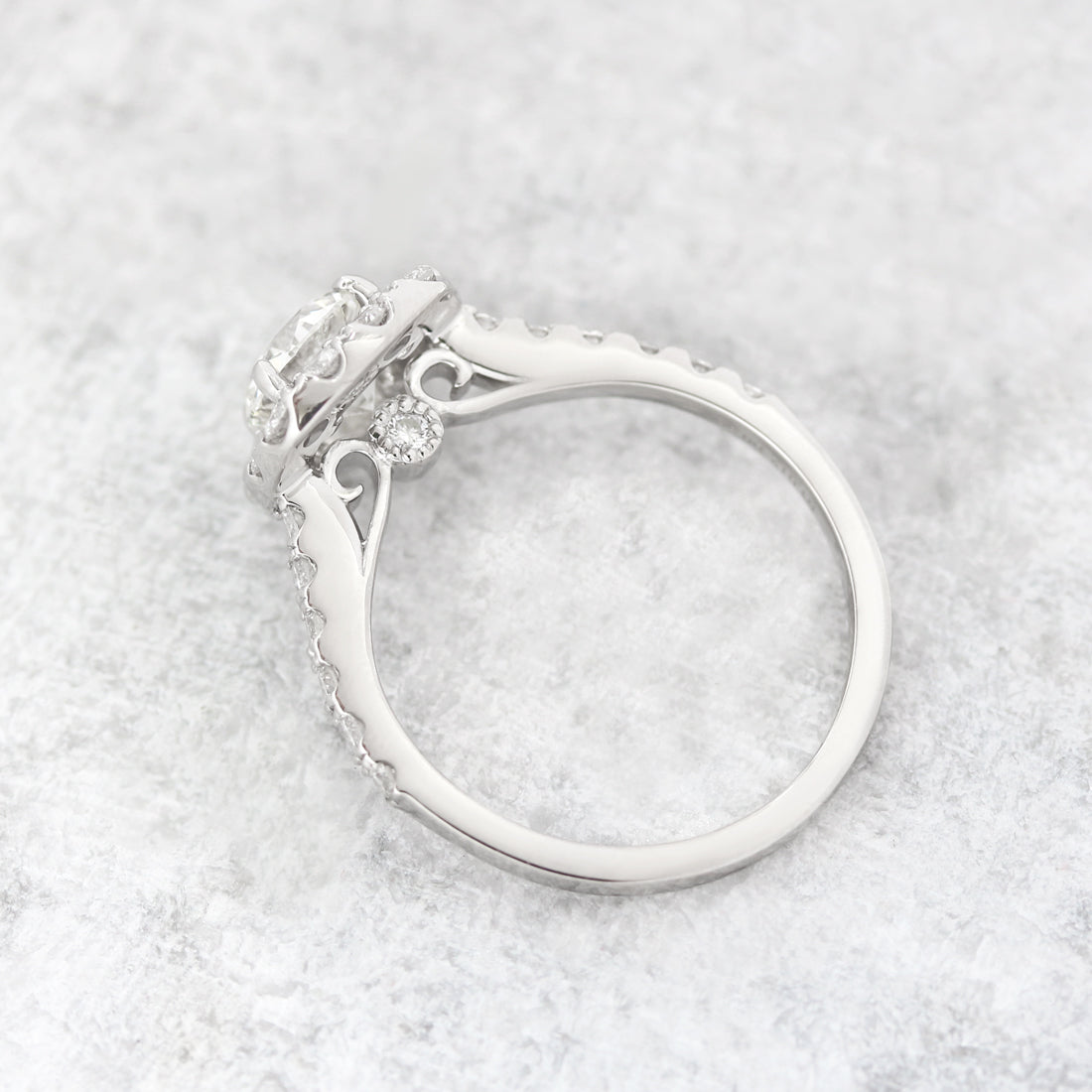 1ctアップのセンターダイヤモンドが堂々とした輝きを放つ、ほぼ無色なHカラーからみずみずしくクリアに輝くリング。