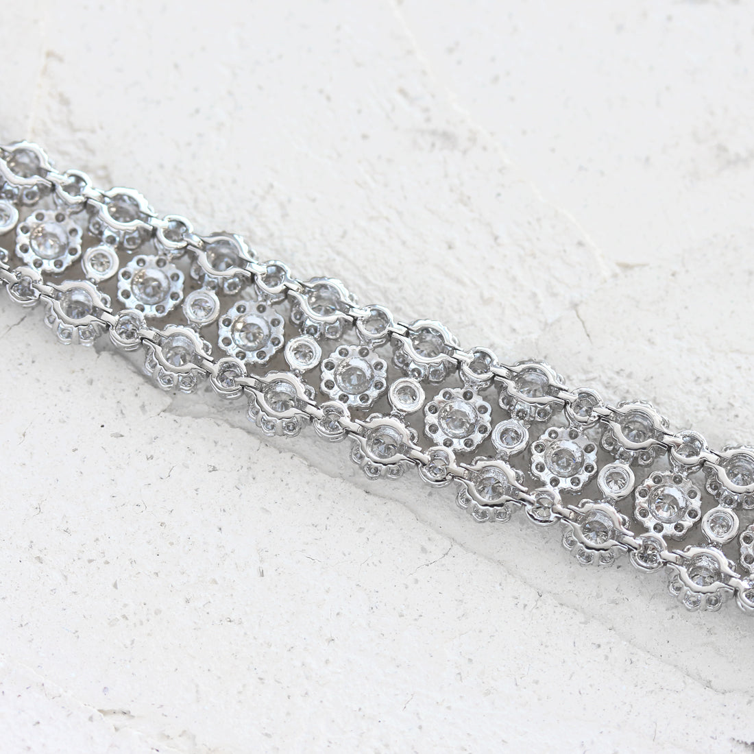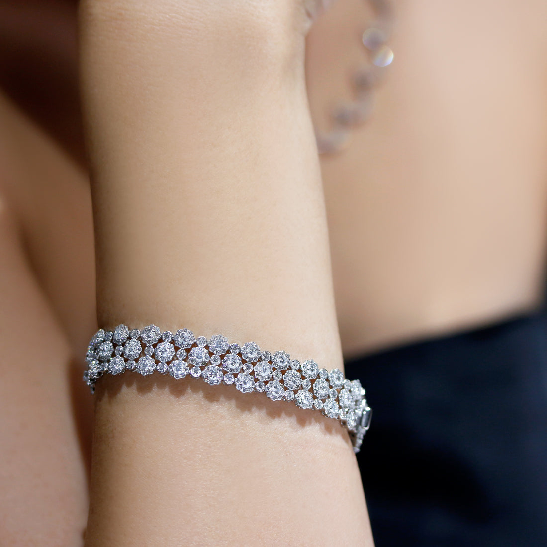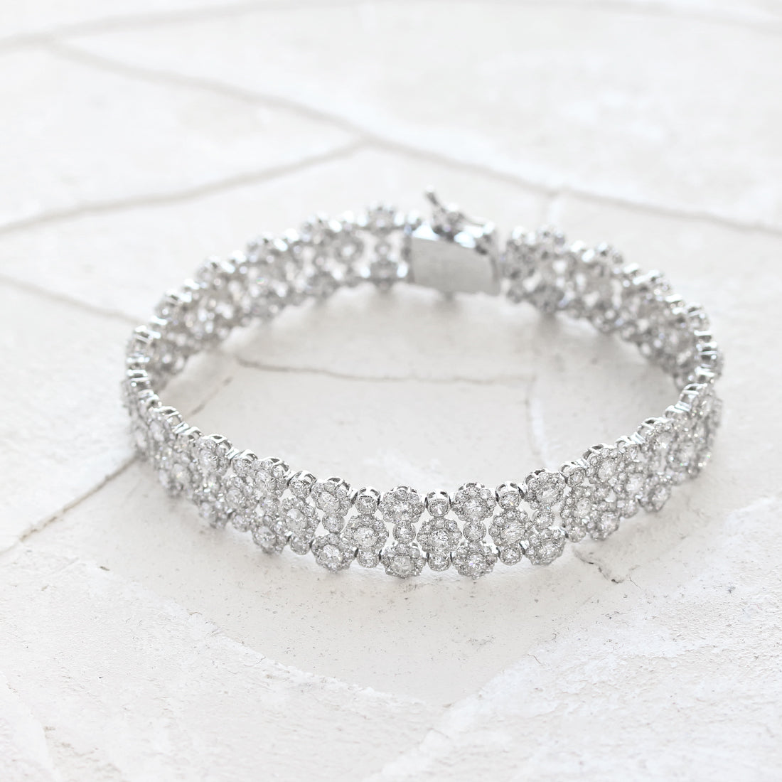 まるで満開の花々が手元を彩るかのように、繊細なフラワーモチーフが連なるフルダイヤモンドブレスレット。
