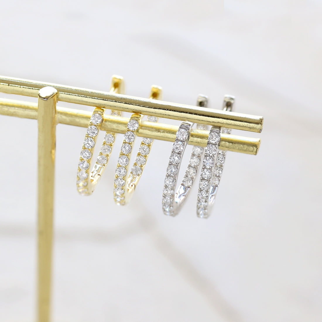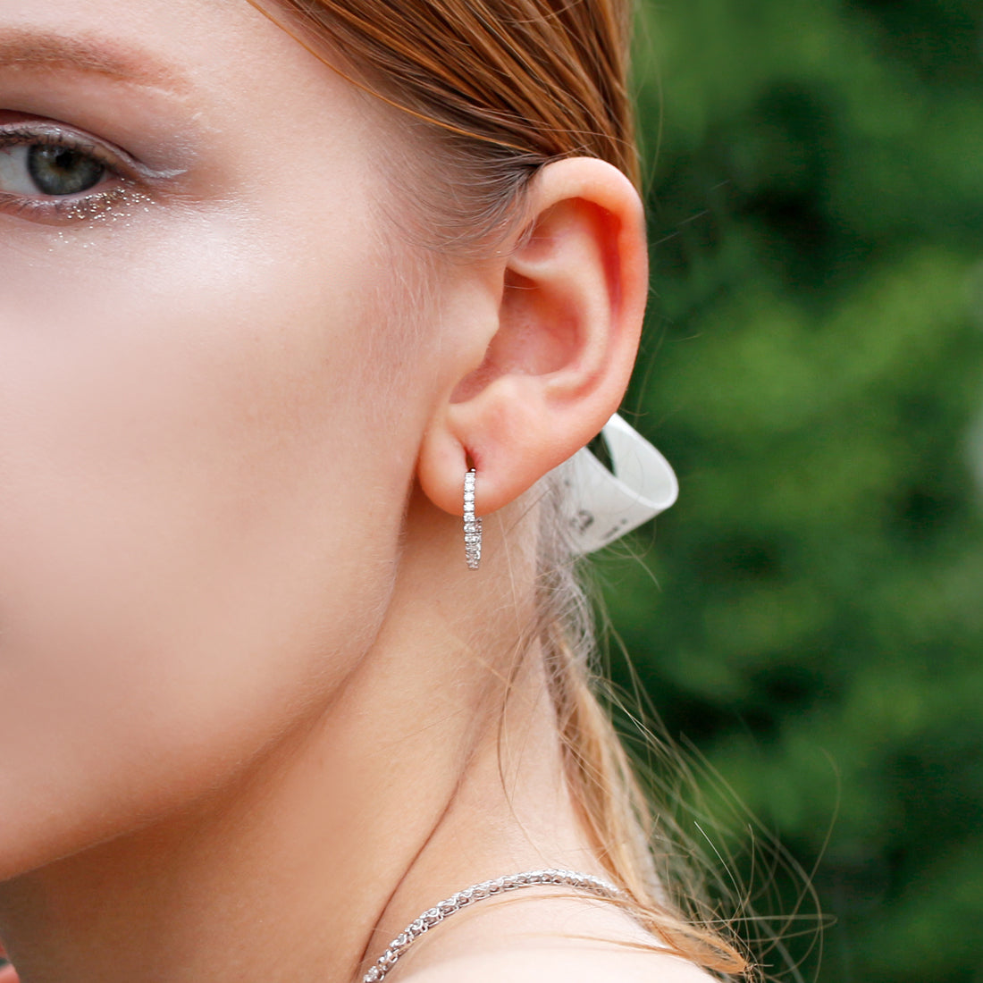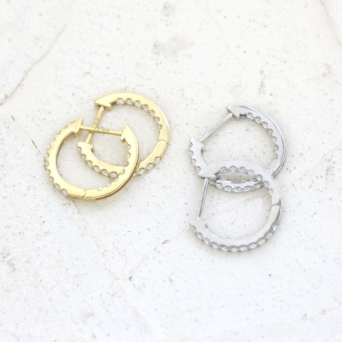 華奢なラインの上でダイヤモンドが輝く、横顔のアクセントにぴったりのピアス。内側のダイヤモンドがさりげなく輝き上品な表情をみせます。中折れタイプでパチンと留めるタイプなので、ひっかかりも少なくお使いいただけます。素肌に馴染むなめらかなフープピアスは、ライフジュエリーとして手放せない存在になってくれるはず。