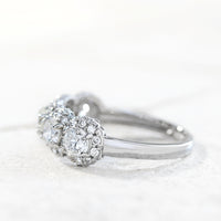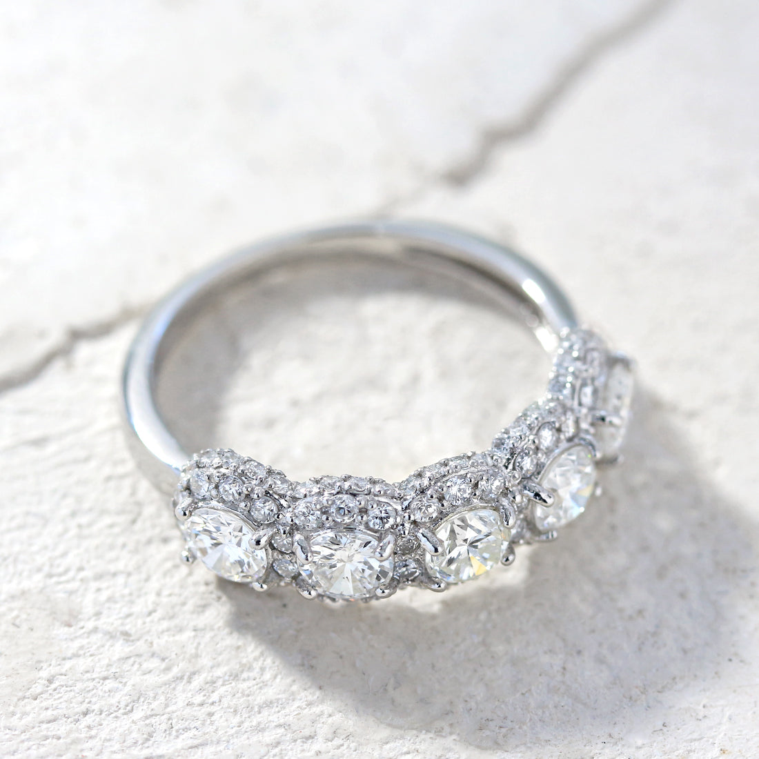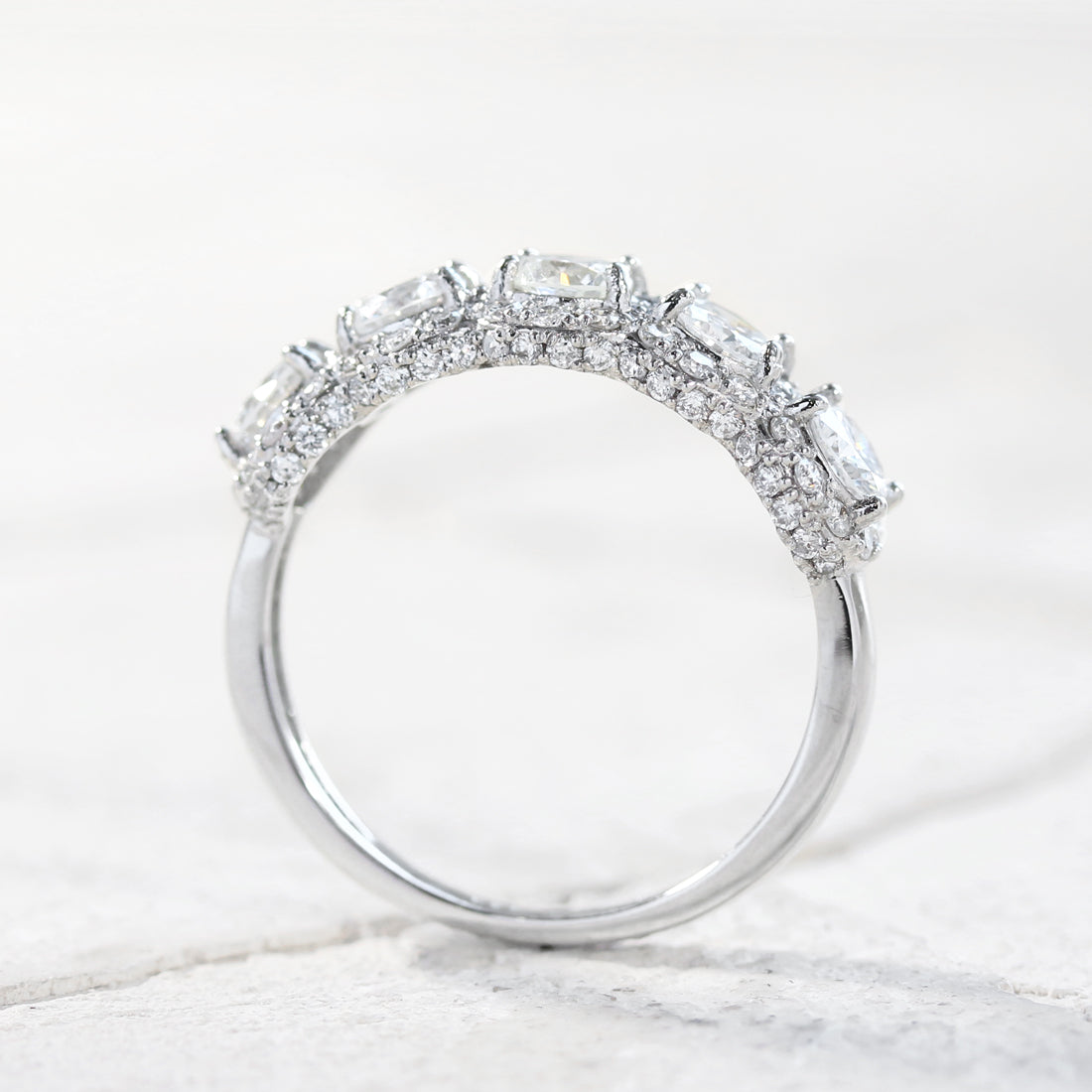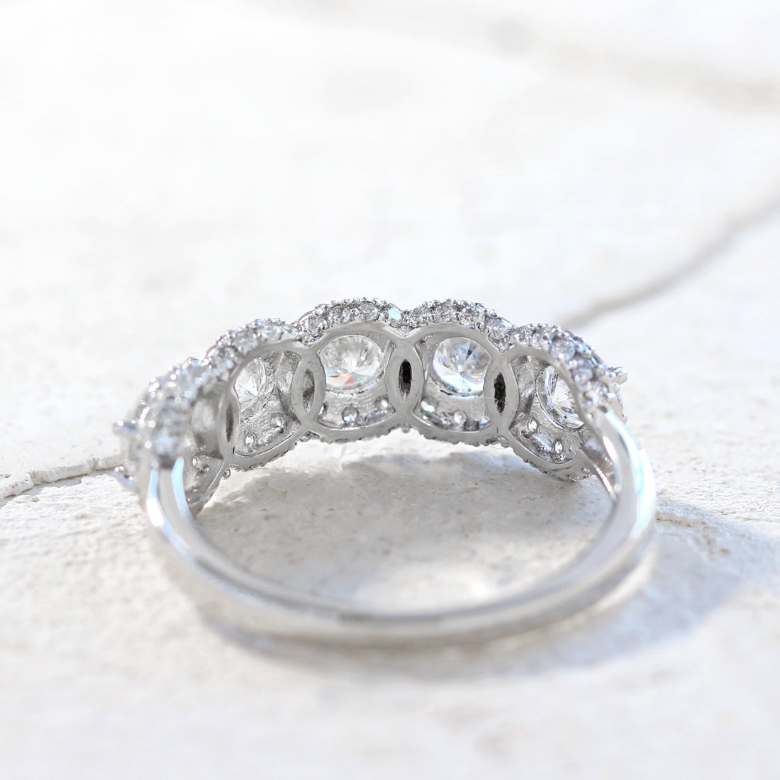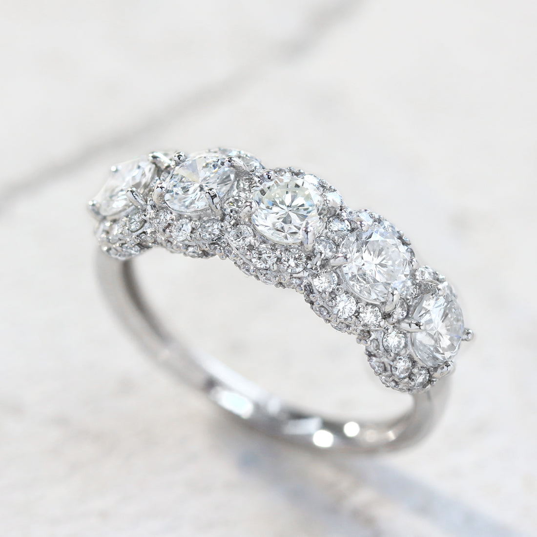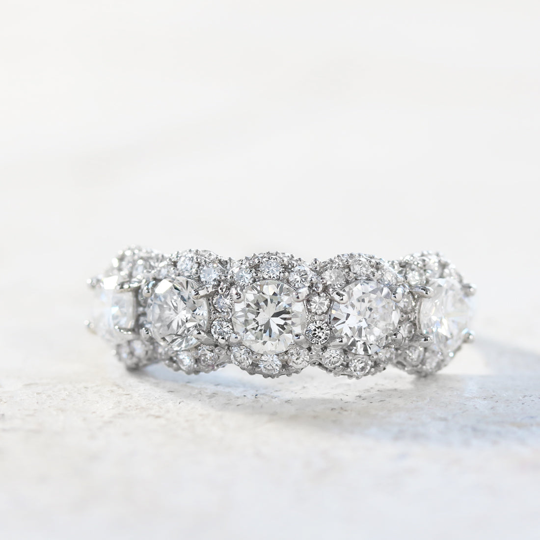5つのヘイローダイヤモンドモチーフを横に並べ、指元にふっくらとした輝きのリズムを描くハーフエタニティリング。