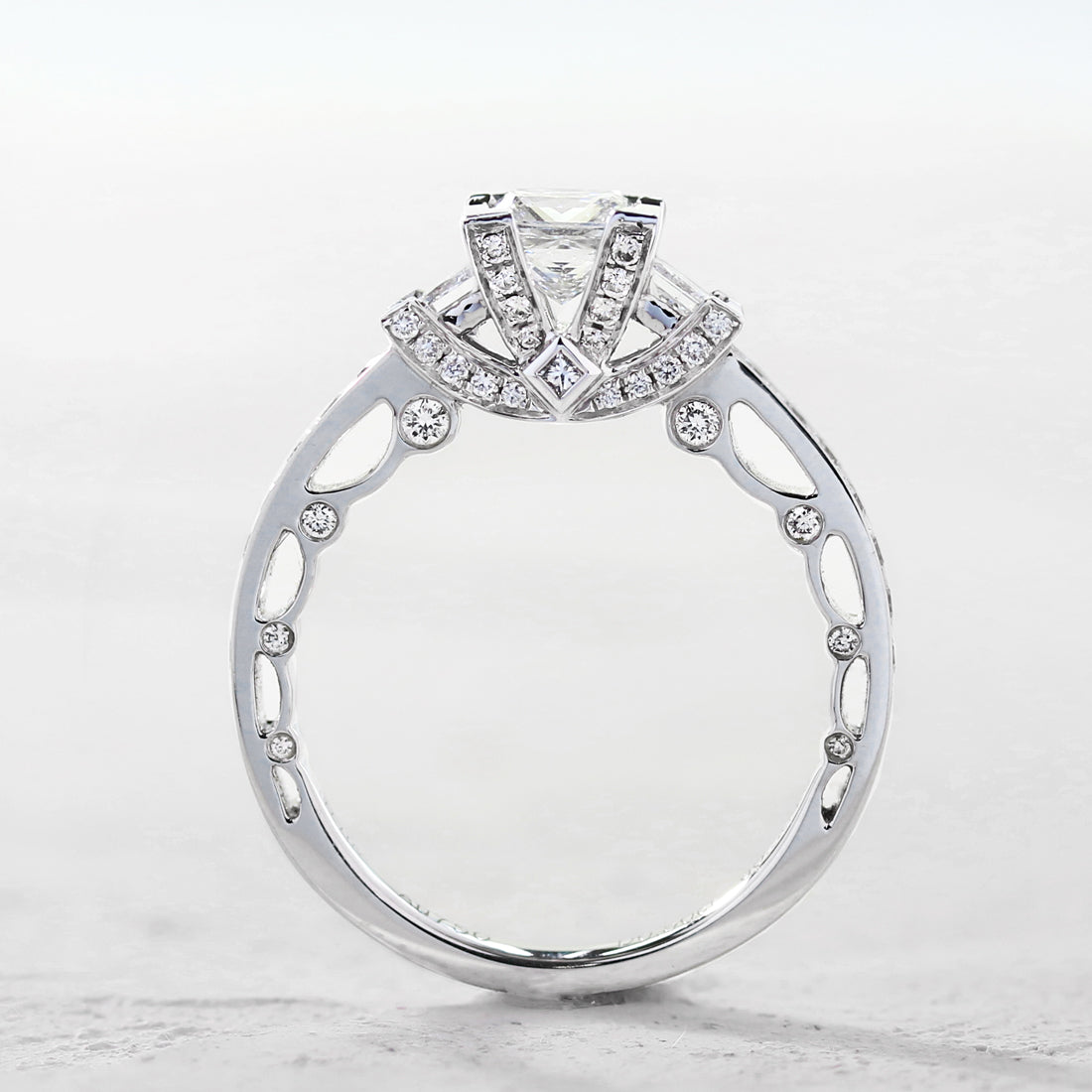 最上級のプロポーションを誇る「Excellent」ランクのシャープなスクエアフォルムは、直線的でありながらも優雅な印象を与え、ダイヤモンドを留める爪やアームの高いデザイン性にも現代的なセンスを感じるこだわりのリングです。