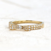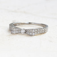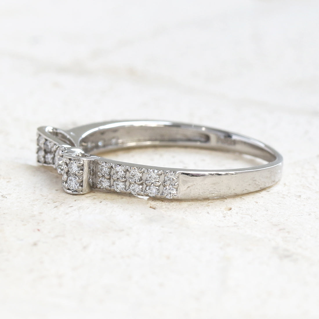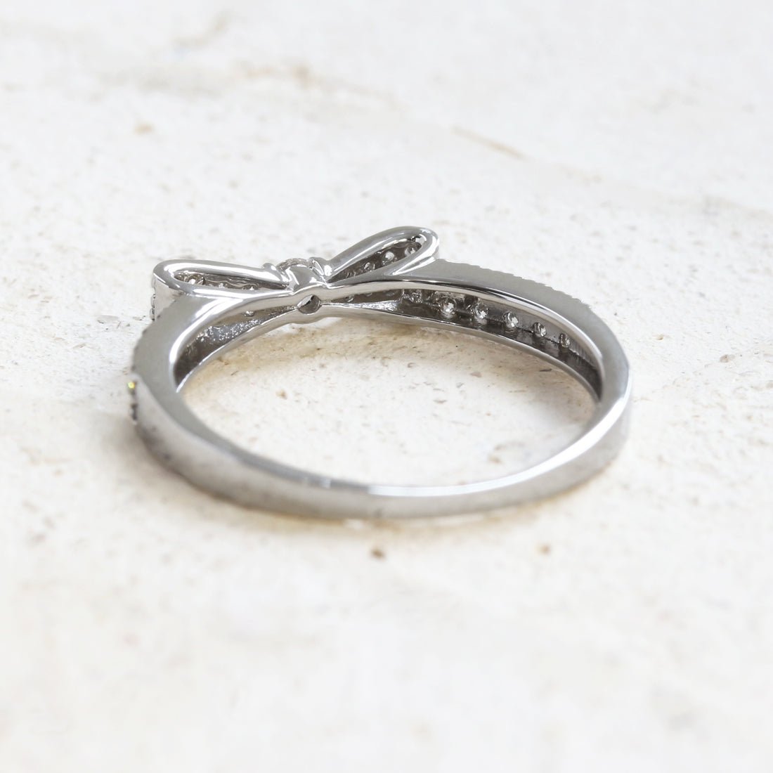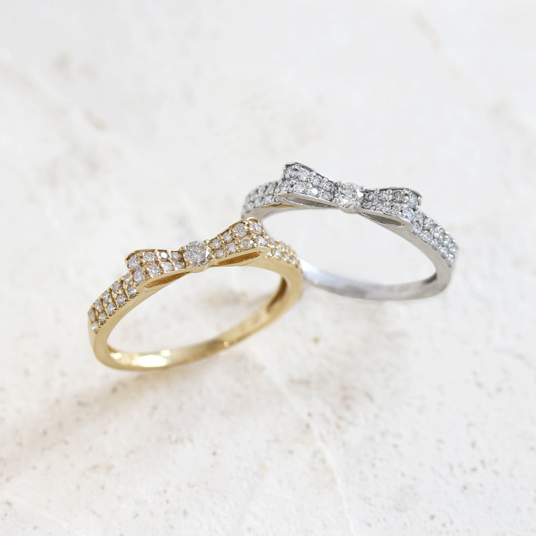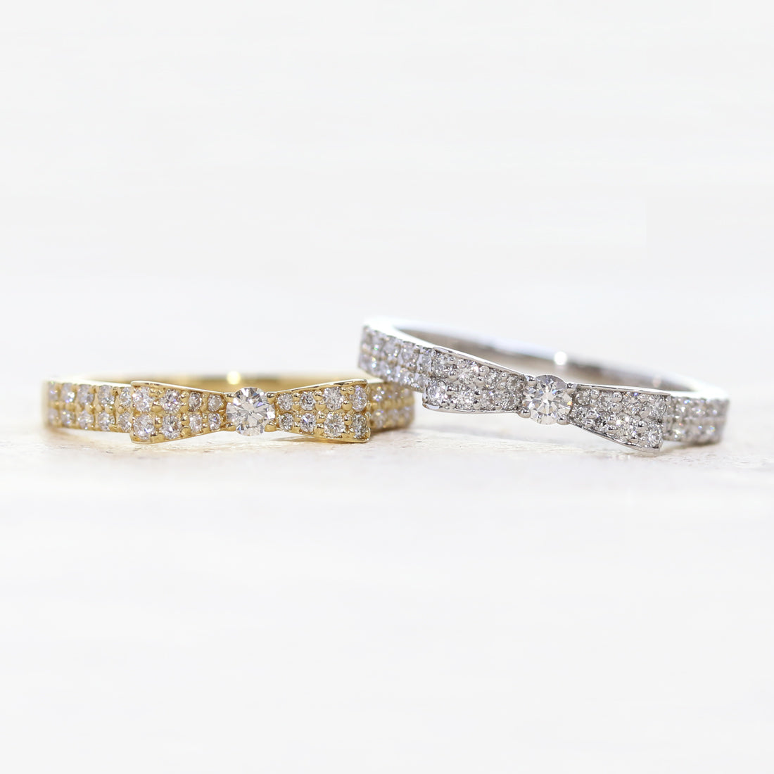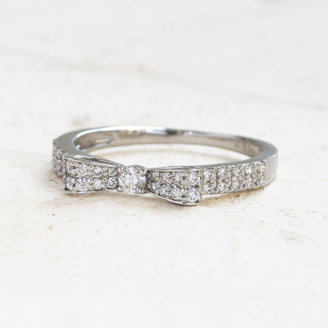 と透明感溢れる輝きを魅せてくれるダイヤモンドが敷き詰められており、どの角度から見ても常に間無く輝き、非常に美しい逸品です。 センターに施されているリボンのデザインが凛とした、女性らしい演出します。