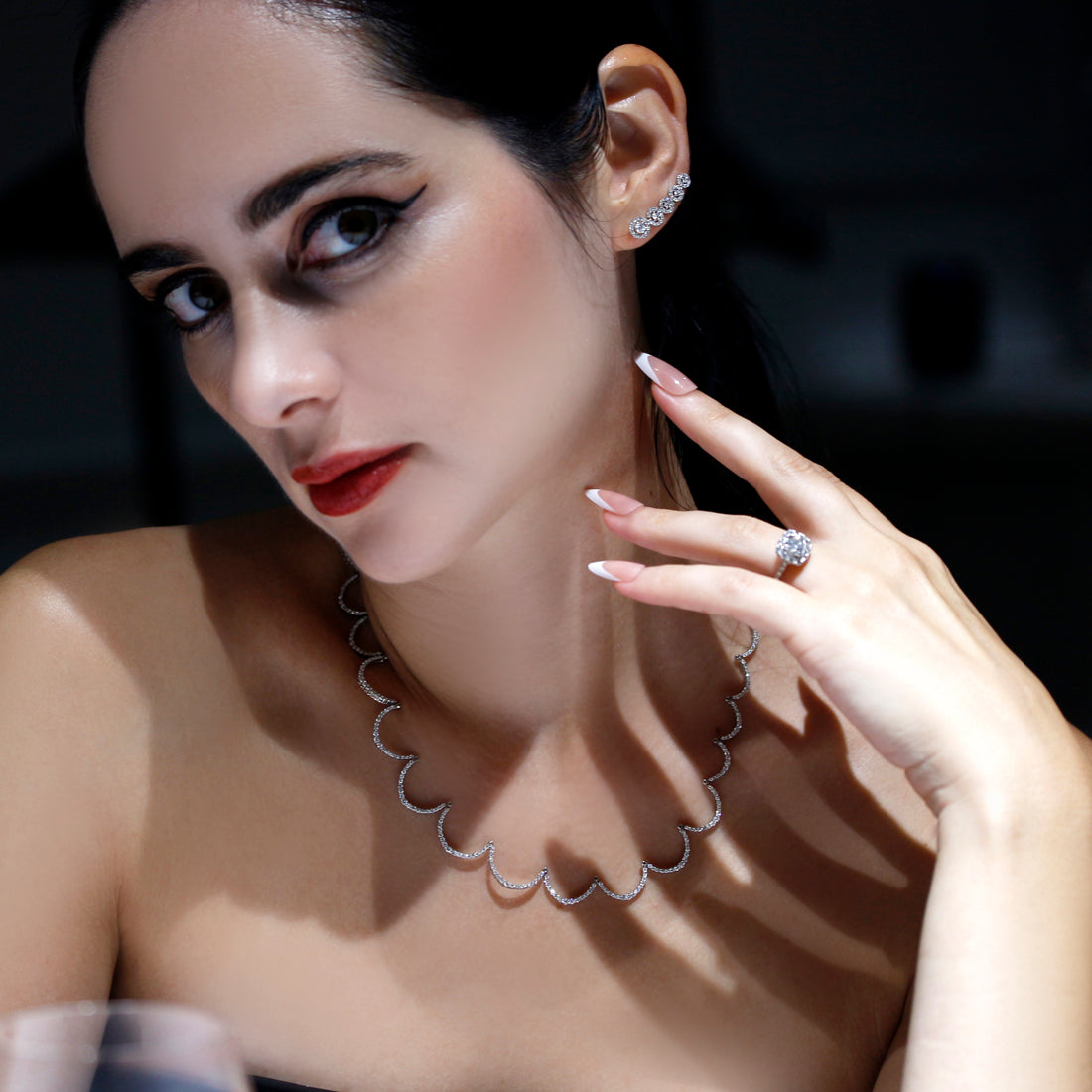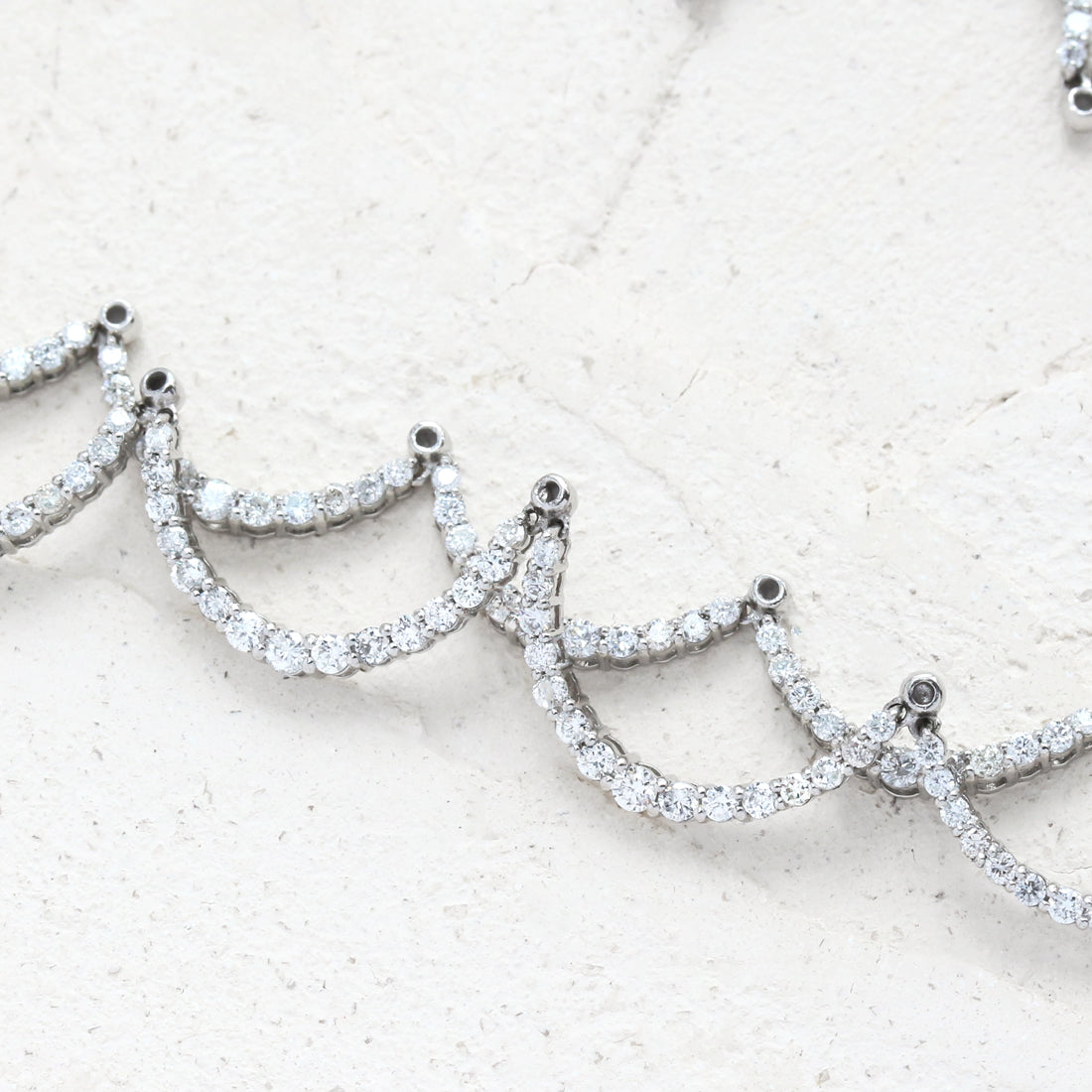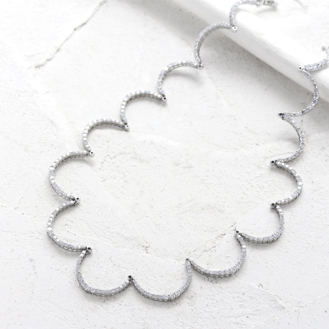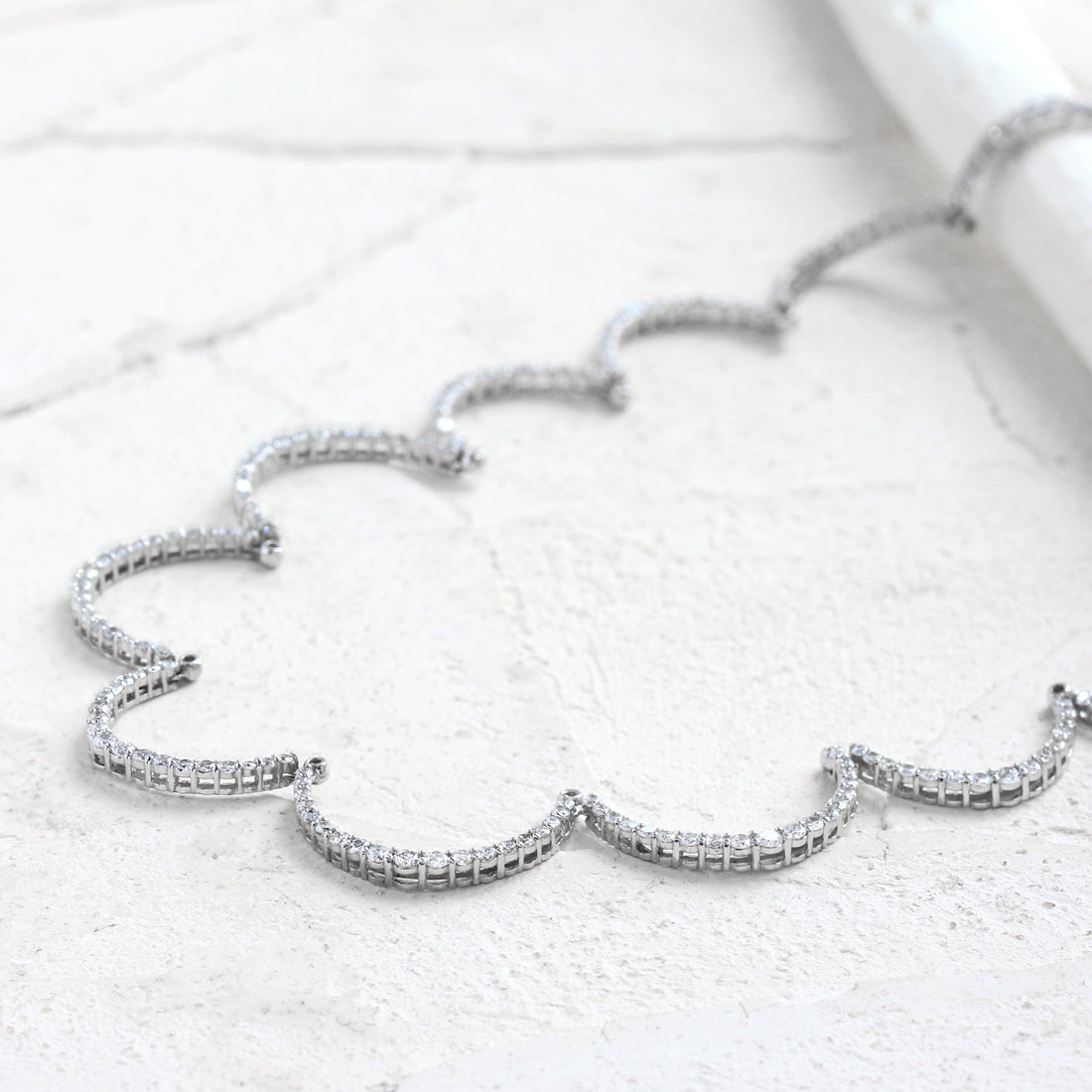 光を受けて繊細に煌めくダイヤモンドをぐるりと並べ、ウェーブを描くように仕立てたスカラップダイヤモンドネックレス。ひと粒ひと粒クリアな輝きを放ち、その確かな存在感がデコルテからお顔周りをやさしく彩ります。上品かつフェミニンなデザインは華やかなシーンはもちろん、シンプルなコーディネートのアクセントとしてもおすすめです。