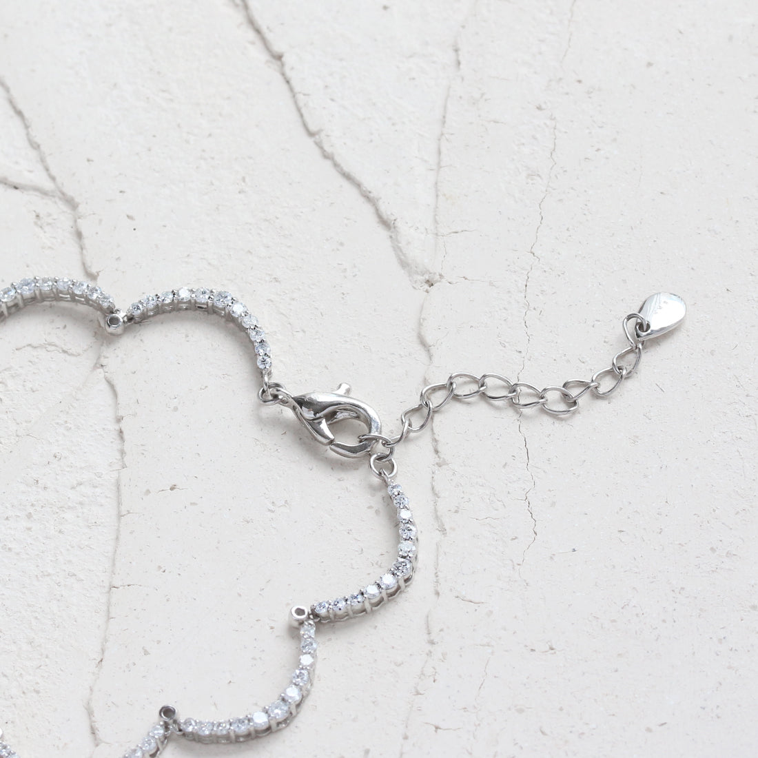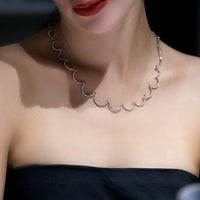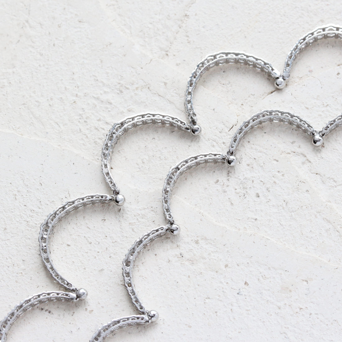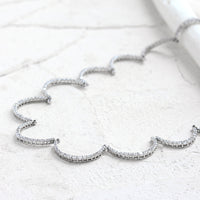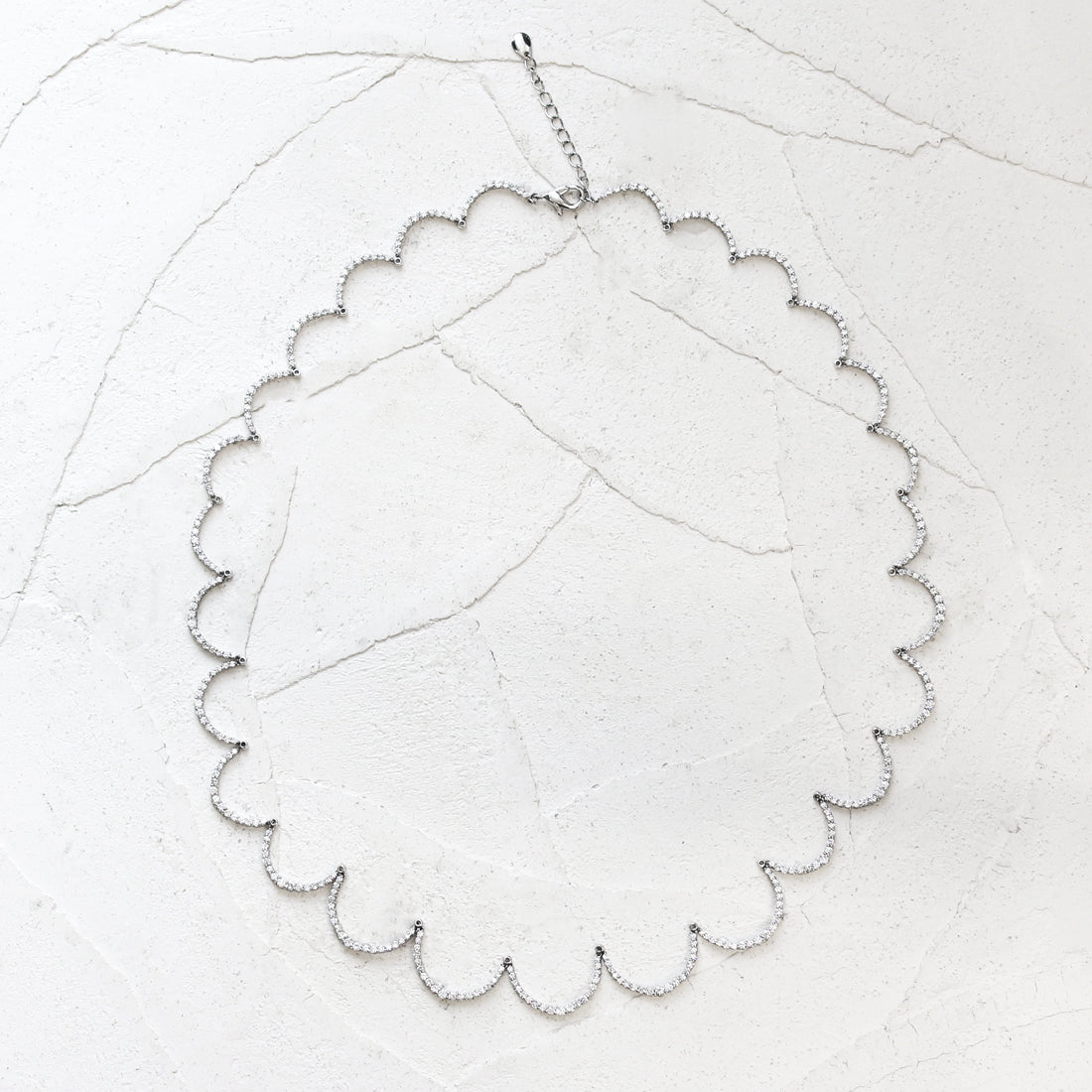 光を受けて繊細に煌めくダイヤモンドをぐるりと並べ、ウェーブを描くように仕立てたスカラップダイヤモンドネックレス。ひと粒ひと粒クリアな輝きを放ち、その確かな存在感がデコルテからお顔周りをやさしく彩ります。上品かつフェミニンなデザインは華やかなシーンはもちろん、シンプルなコーディネートのアクセントとしてもおすすめです。