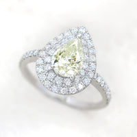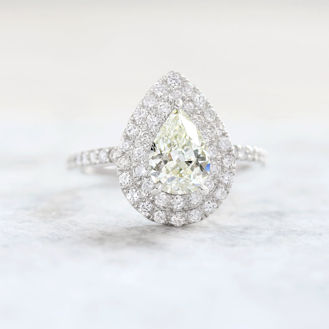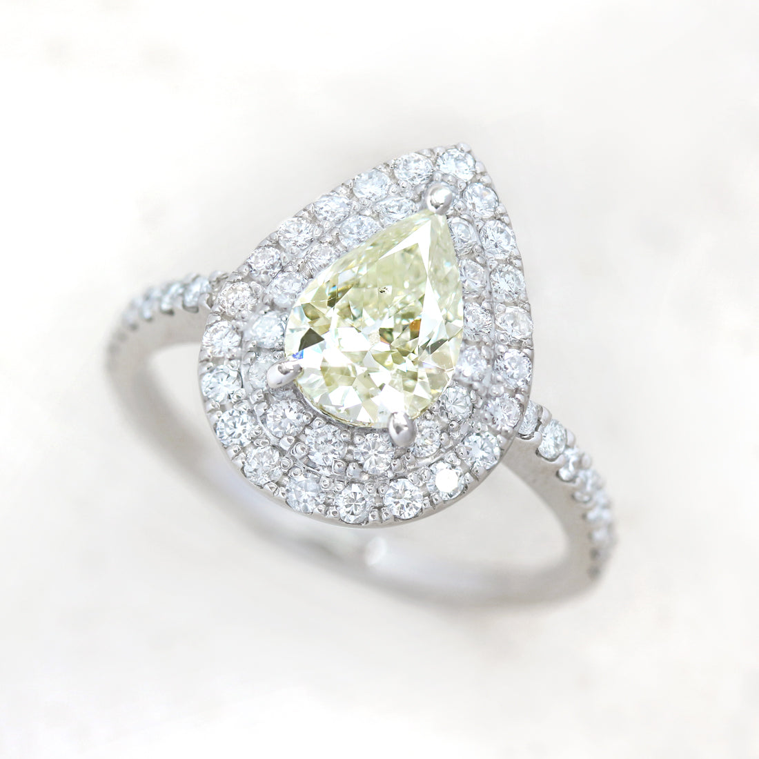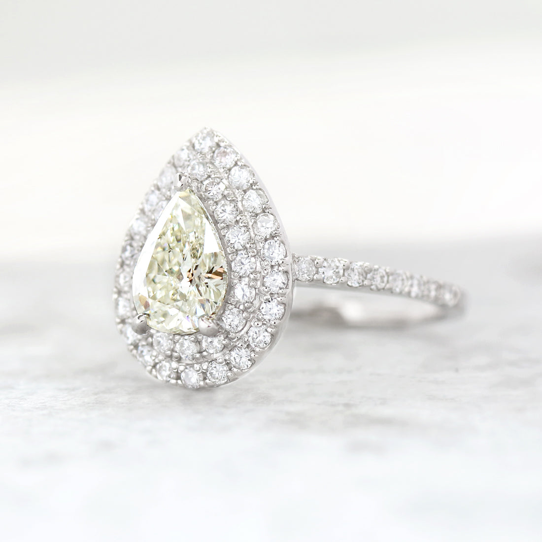 眩い虹色の煌きをたっぷりと放つペアシェイプダイヤモンドリング。