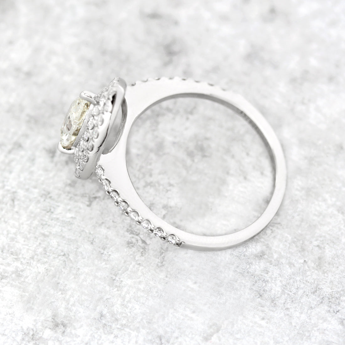 メインのダイヤモンドのまわりをメレダイヤを二重にセッティングし、存在感のある輝きが指元をパッと華やかにしてくれます。