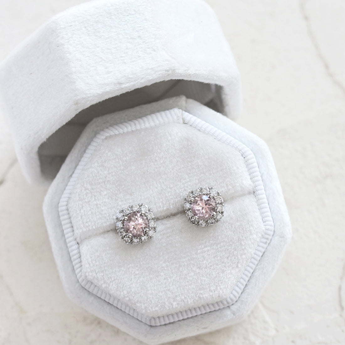 周りを取り囲むメレダイヤモンドが、モルガナイトの柔らかな色彩に繊細な煌めきを添え、上品な存在感溢れる仕上がり。