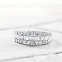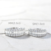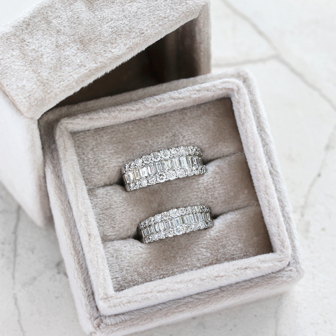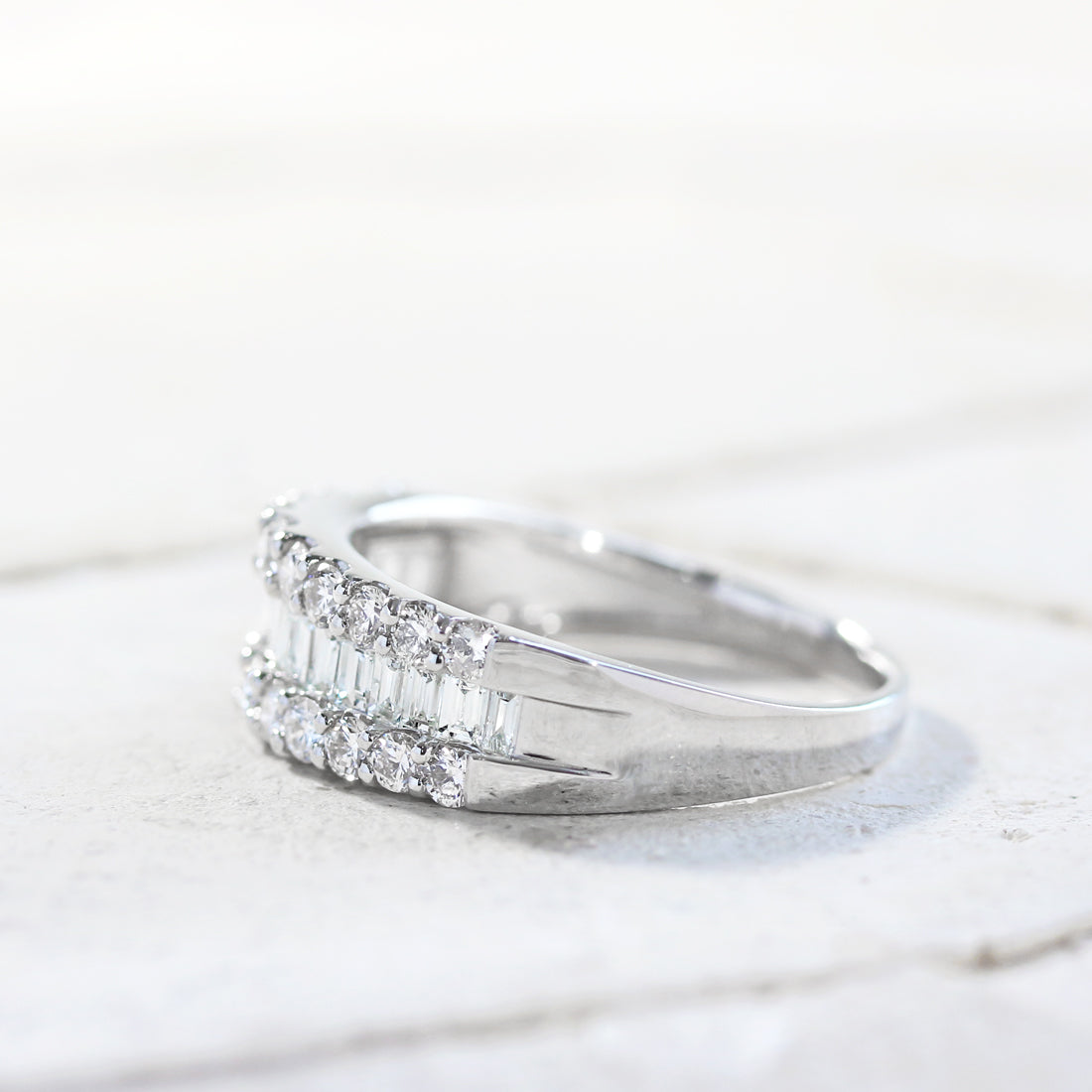 丁寧に並べられたバゲットカットダイヤモンドのシャープな美しい光と、その両側を取り巻くラウンドカットダイヤモンドのはじけるような煌めきが、リズミカルで立体的な輝きを奏でます。