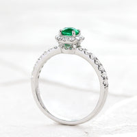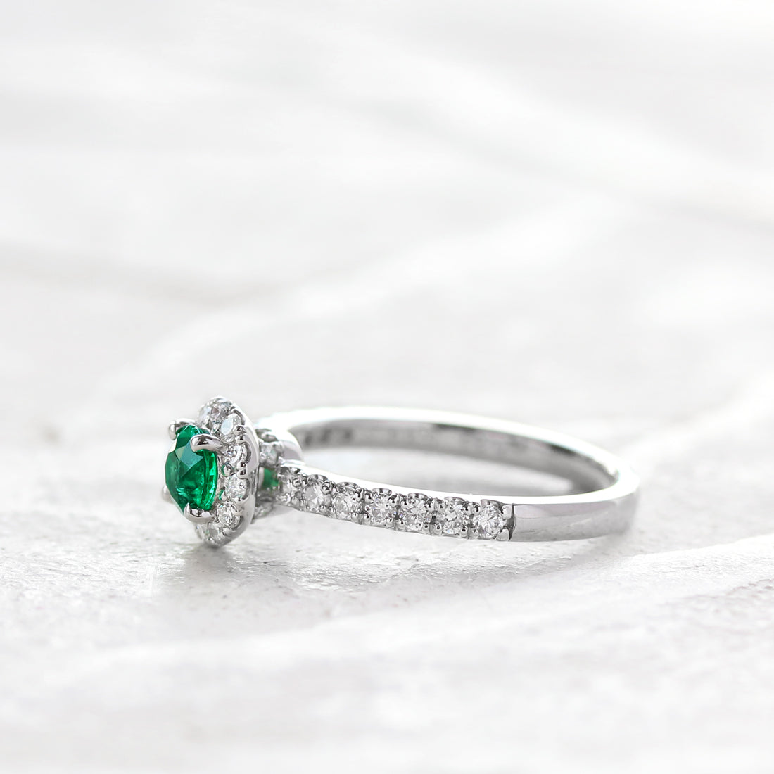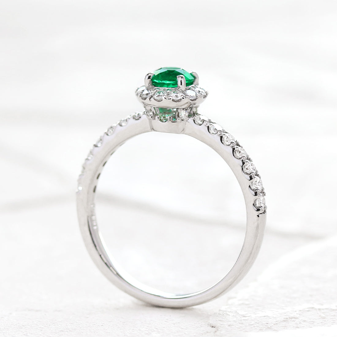 鮮やかな青緑色が印象的なエメラルドを主役に、メレダイヤモンドで取り巻いたヘイローリング。
