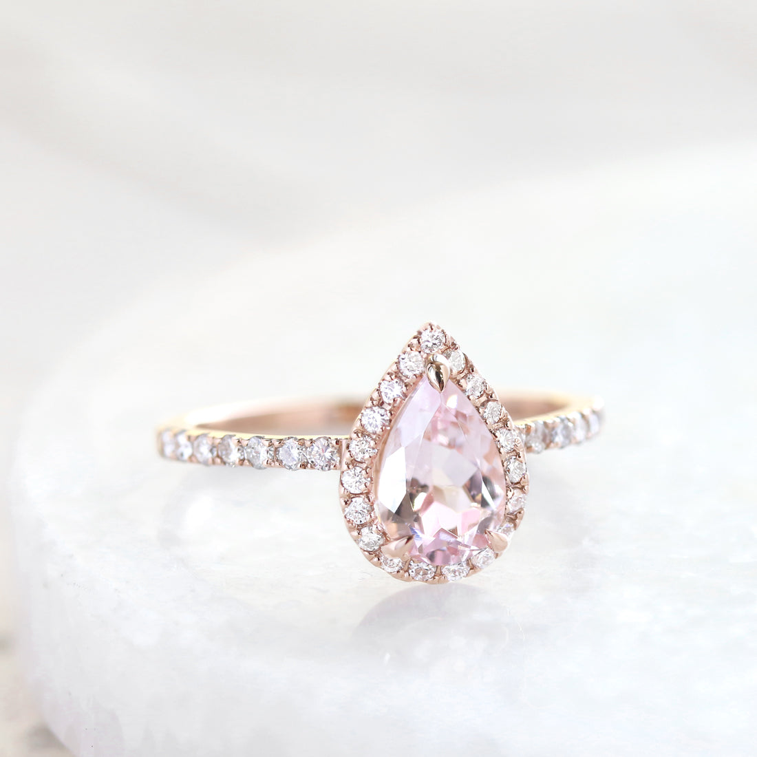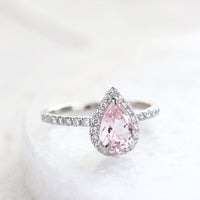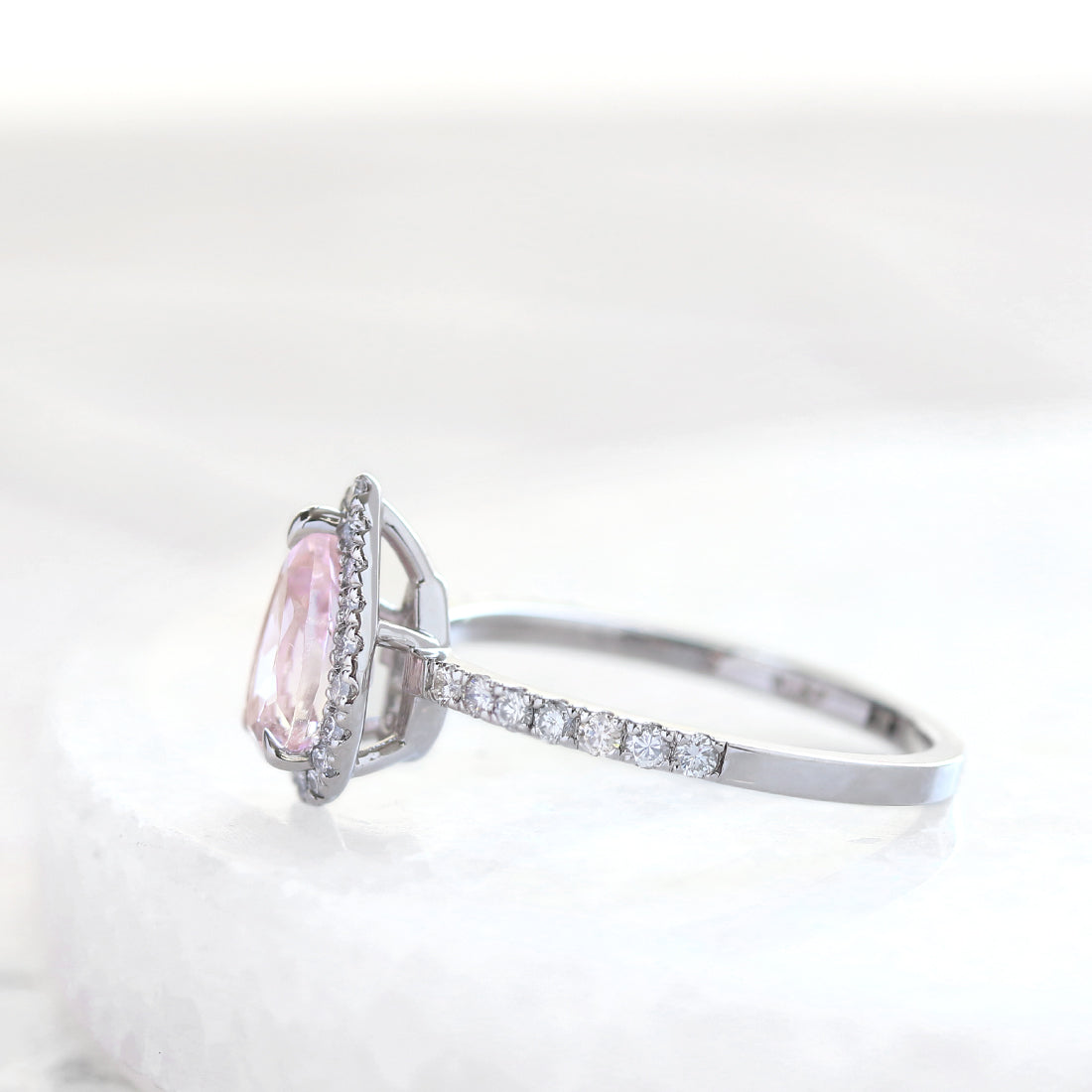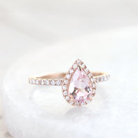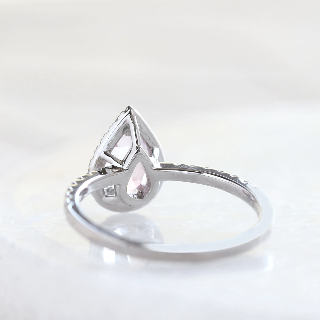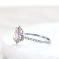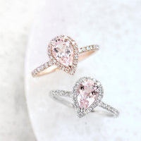 陽だまりに舞う花びらのように、やさしく上品な桜色が広がるペアシェイプカットのモルガナイト。