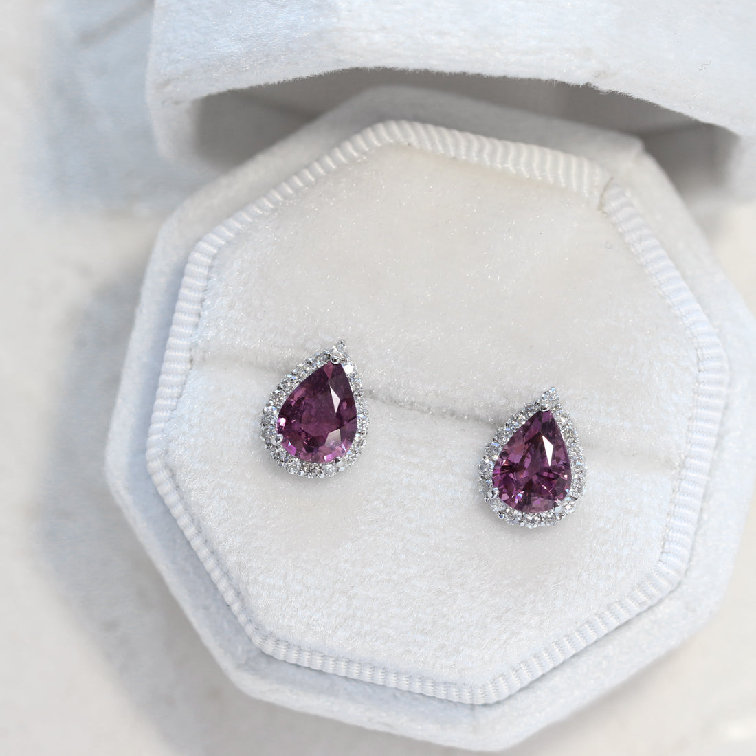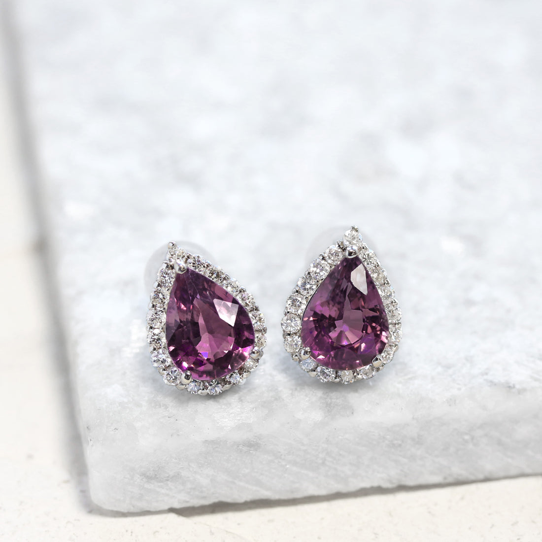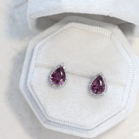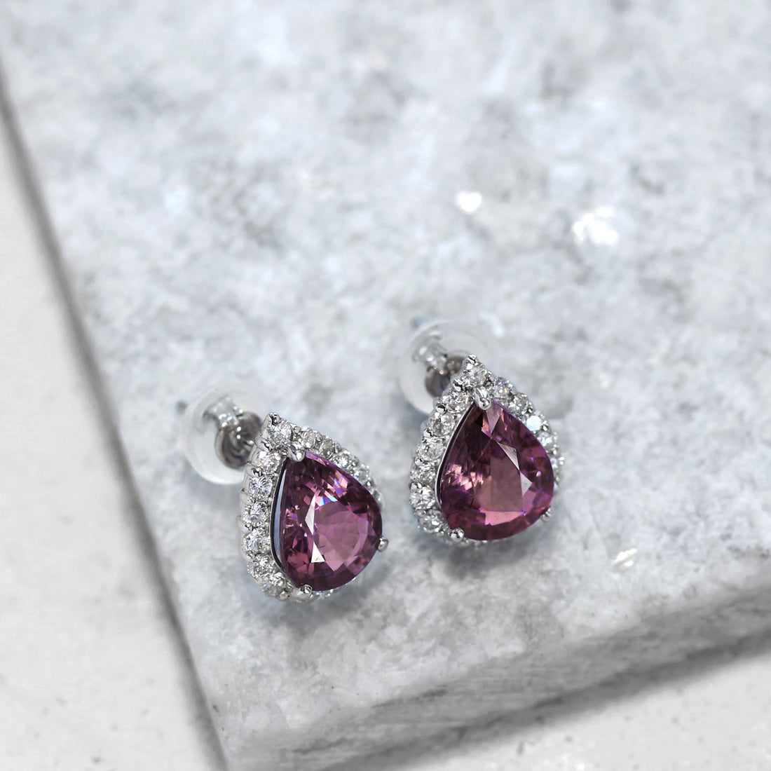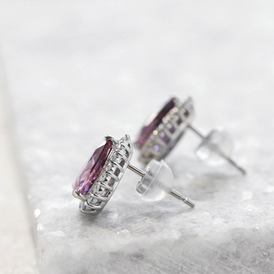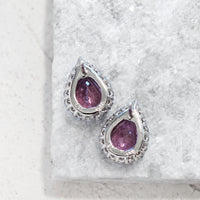 ほのかにピンクを溶かし込んだような、透明感あふれる紫の輝きが広がるパープルサファイアピアス。