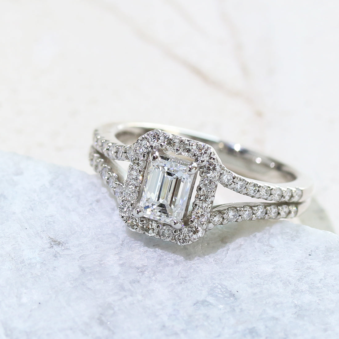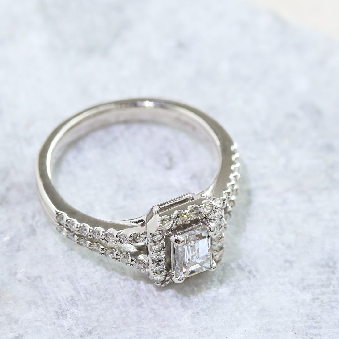 手元を動かすたび、長方形のステップカットならではの“鏡の世界”が生まれ、光の世界へ誘われるような魅力を放ちます。